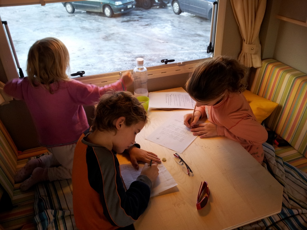Ensuite, nous avons vécu notre premier teste « écolage » à l’intérieur de Rhino. Si cela c’est plutôt bien passé, il faudra tout de même s’adapter un peu à ce petit espace. Si Soraya et Jimmy, étant pris dans leurs devoirs, sont restés assez disciplinés, Amélie a eu besoin d’un moment d’adaptation. Elle a fini par rester dans « sa chambre », en fait sur son lit, pour lire des livres. Les 2 grands ont tout de même travaillé vaillamment pendant 1 heure et demie.
