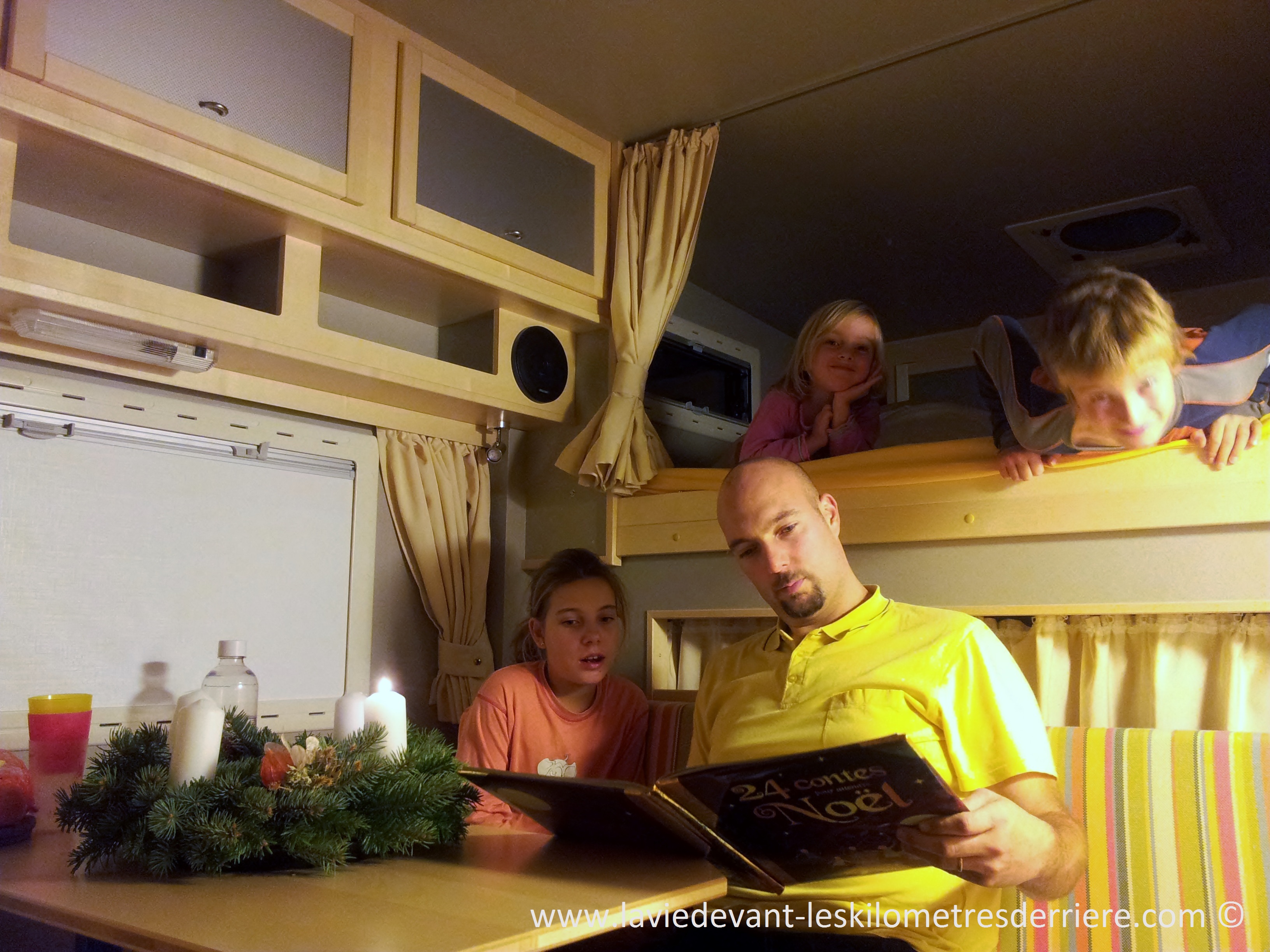 Une fois les devoirs et le souper terminés, nous avons pratiqué pour la première fois aussi, dans Rhino, Notre rituel de la période de l’avent. Si nous n’avons pas pu emporter le calendrier de l’avent, car trop grand, nous avions pris la couronne et notre livre des « 24 histoires en attendant Noël ». Depuis plusieurs années, nous avons cette tradition. Nous ouvrons le calendrier, allumons les bougies de la couronne et nous mettons ensemble sur le canapé pour écouter/lire l’histoire du jour, différents récits de par le monde sur la fête de Noël.