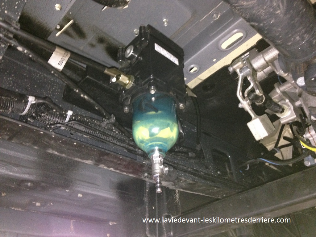 Tout d’abord, nous avons installé un séparateur d’eau à la sortie du réservoir de carburant. Cet appareil est conçu de manière à parer la présence d’eau dans les diesels d’Amérique du sud. Non seulement cette présence est très mal supportée par les moteurs de nouvelle génération européens !