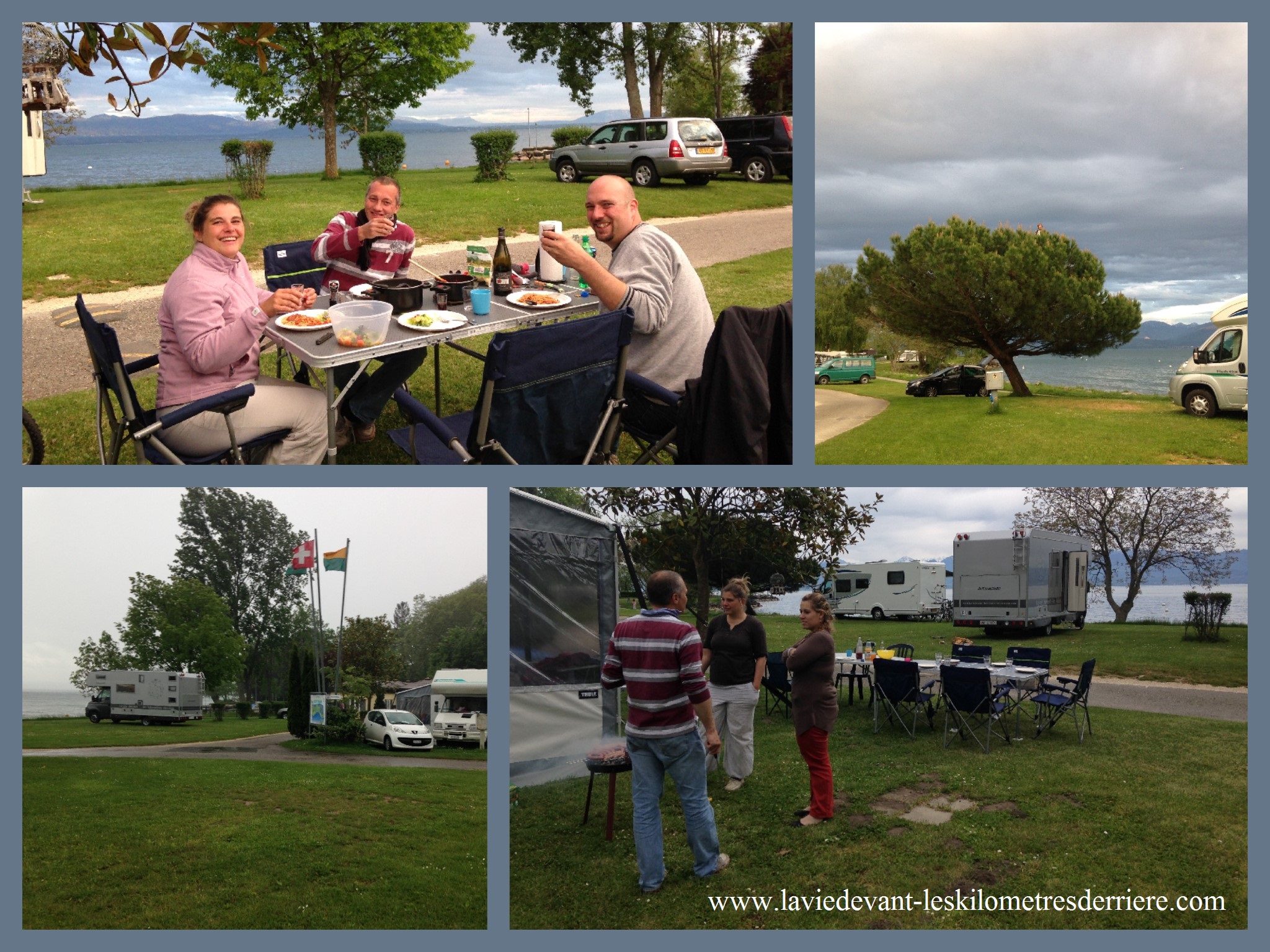 Jérôme et Alexandra ont déjà tout abandonné matériellement et se sont installés dans ce camping très bien situé sur les rives du lac Léman, entre Nyon et Morges. Si pour une vie de nomade le camping-car semble suffisant, lorsque la vie professionnelle continue, ainsi que la scolarité publique des enfants, l’espace d’un c-c est peut-être un peu juste. C’est pour cela que les nomadistes ont installé pour ces 3 mois de vie en camping un auvent qui leur double leur surface habitable. La météo du samedi nous a permis de manger à l’extérieur. Par contre, le dimanche à l’heure du petit déjeuner comme du dîner, leur auvent fût fort pratique et voir même indispensable pour manger tous ensemble !