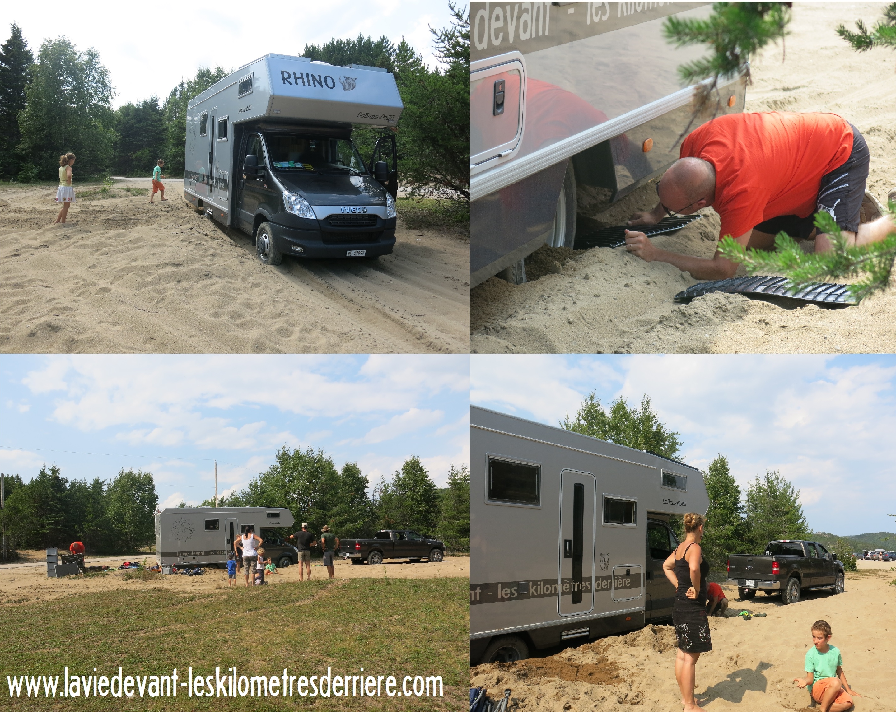 Comme nous avions bien senti que les camping-cars n’étaient pas les bienvenus dans ce village, nous avons pris la route pour aller à 10 minutes de là, aux dunes, une place conseillée par plusieurs personnes. Une superbe place, vraiment. Sauf que lorsque j’ai vu un chemin qui menait au parking j’ai bifurqué. C’était un chemin emprunté par des par des 4×4 et Rhino s’est retrouvé lamentablement planté à 10 m de la route et 50 m du parking. J’ai mis les plaques de désensablement souples, le système que j’avais reçu du québécois, mais rien n’y a fait. J’ai pellé, mes suis couché dans le sable pour dégagé le pont arrière, mais que nenni encore ! Nous avons appelé un québécois avec un 4×4 pour nous aider. Il a essayé de nous tirer à reculons, mais après un mince espoir qui nous a fait gagner 1 m, j’ai enfoncé Rhino jusqu’à poser les 2 roues de secours sous châssis sur le sable ! Nous pensions que s’en était fini et qu’une dépanneuse à camion serait la seule à même de nous venir en aide. Ma foi, dans un dernier espoir je demande à Fred, le local nous étant venu en aide, de venir par l’avant et d’essayer une dernière fois, même si les 50 m jusqu’au parking semblait en faire 500 ! J’ai mis les plaques à l’avant des roues de propulsion, il a tendu la corde de remorquage et nous avons mis les gaz très gentiment. Hourraaaa, Rhino s’est replanté 1,50 m plus en avant mais cette fois-ci le véhicule s’était relevé et plus rien ne touchait le sable, hormis les roues. A l’essai suivant, les plaques ont permis de prendre de l’élan et nous sommes ressortis, 1h30 plus tard, de cette mauvaise affaire. Un énorme merci à Fred, Andréanne et leurs 2 enfants, Coralie et Emile, qui nous ont été d’une aide précieuse. De plus, c’est Fred qui m’a offert une bière car les miennes n’étaient même pas au frais ! Quelle honte !