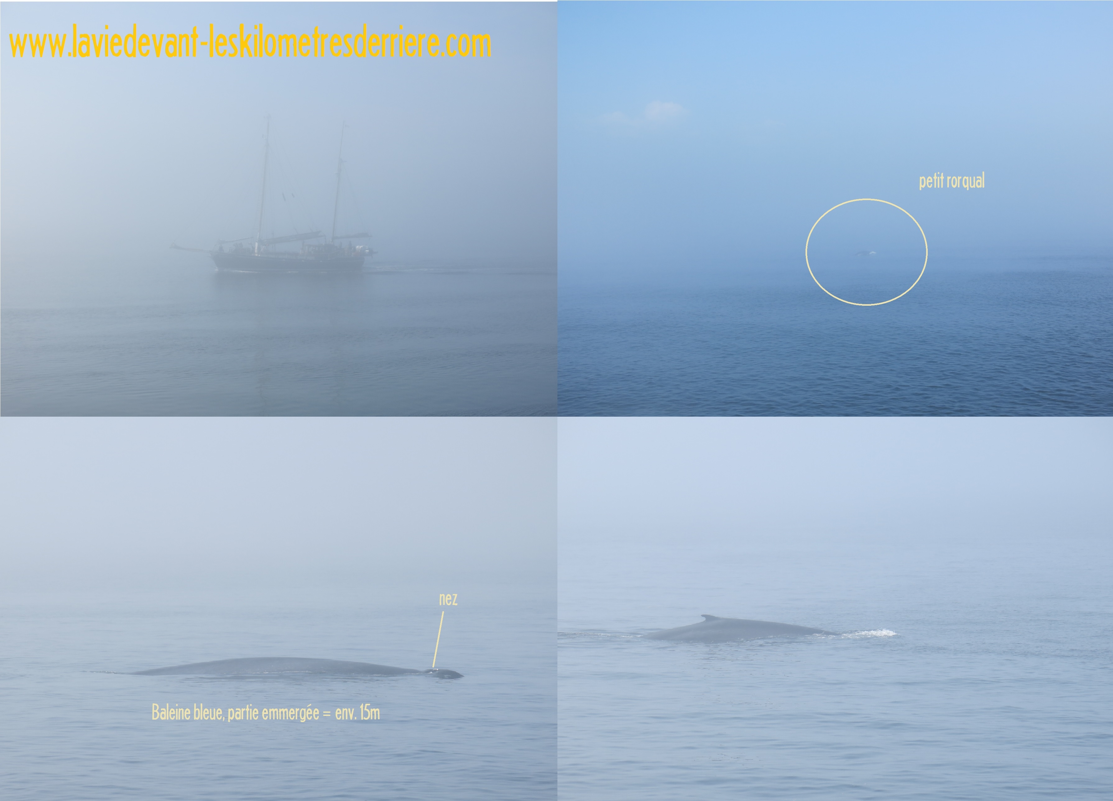 En ce dimanche matin, 3 aout, nous nous sommes réveillés avec en tête notre sortie baleine ! Départ du bateau à 9h45 dans la marina de Tadoussac. Nous avons choisi d’y aller avec un navire assez gros, mais l’autre seule alternative des zodiacs. Malheureusement, ce genre de bateau ne convient guère à mos dos. Donc, c’est parti pour la chasse aux baleines, la noble bien sûr, celle faite pour observer et non détruire. Les baleines le plus souvent observées sont : La baleine à bosse et le rorqual (et le petit). Parfois, il est possible de voir des Belugas et des baleines bleues. Le trip débute assez mal. En ce jour, la mer est recouverte de brume et la visibilité ne dépasse sûrement pas les 3 à 500 mètres. Nous imaginions déjà, avec Claire, avoir dépensé 200$ inutilement. La nature nous a finalement offert un spectacle qui n’a pas de prix. Dans un premier temps, nous avons pu observer 2 petits rorquals et pleine chasse. Après quelques minutes, le bateau a changé de cap à la recherche de nouveau spécimens, les premiers étant redescendus dans les fonds. Soudainement, l’animatrice nous demande d’écouter car de la brume semble venir le son du souffle de baleine. Une baleine à bosse, pense-t-elle. Finalement, l’inattendu se présenta à nous, une baleine bleue, le plus grand animal présent sur terre, pouvant mesurer jusqu’à 30m et peser 130 tonnes. Et voilà qu’une deuxième, dotée d’une nageoire dorsale plus petite, vient sortir son dos devant nous. Les deux fois, Claire, les enfants et moi étions placés idéalement sur le bateau. Les larmes de joies n’étaient vraiment pas loin.
