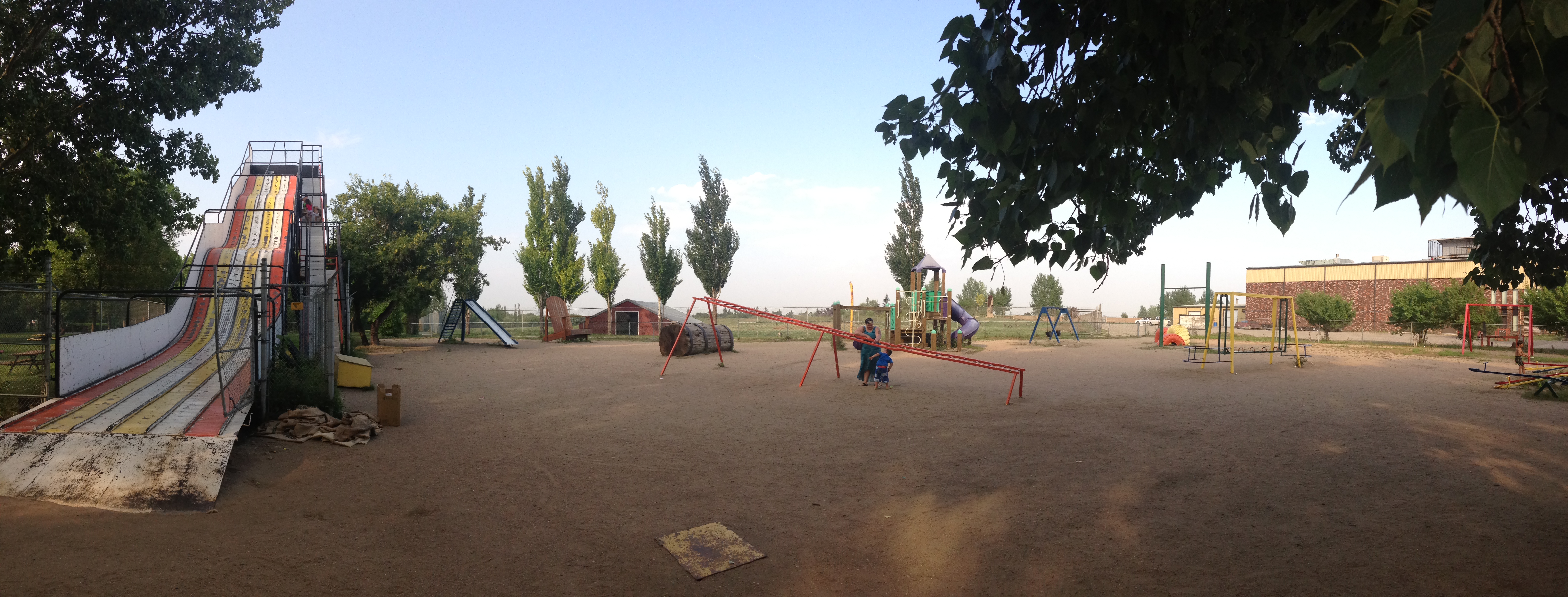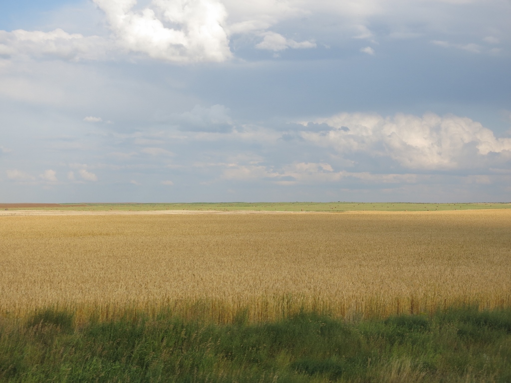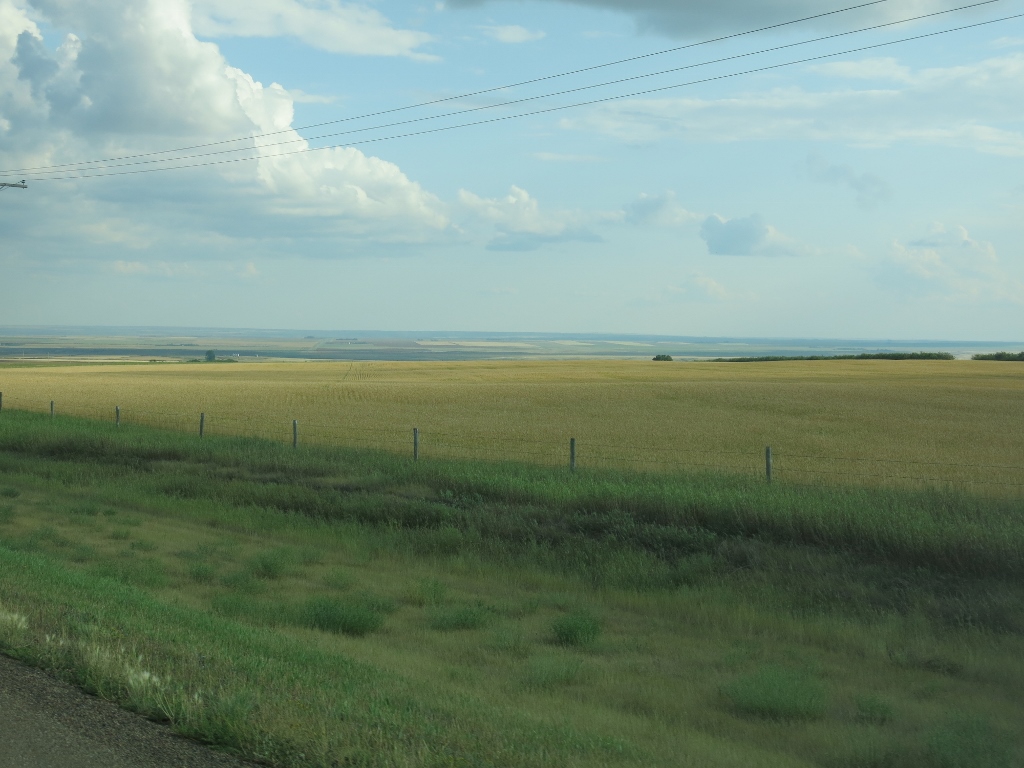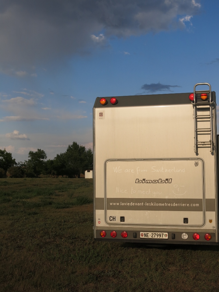 Nous avons repris la route faites de plaines sans fin. L’étendue de ce plateau est inimaginable tant que cela n’a pas été fait. Si beaucoup de voyageurs se sont ennuyés de cette traversée où les longues lignes droites semblent ne jamais finir, nous l’avons vécu avec beaucoup d’admiration. Une telle grandeur doit le respect face à dame nature. Nous avons roulé avec pour objectif de nous approcher au plus du Parc National de Grasslands, mais sans y entrer pour ne pas payer de suite une nuit de camping. Après un arrêt pour acheter des légumes dans un shop de village paysan perdu au milieu de champs dont vous ne pouvez imaginer leur immensité sans y être allé, nous découvrons qu’il s’y trouve une place gratuite pour camper, avec tables et toilettes. Nous décidons alors d’y rester pour la nuit. Les enfants ont adoré pouvoir sortir et courir comme bon leur semblait après tous ces jours de route.