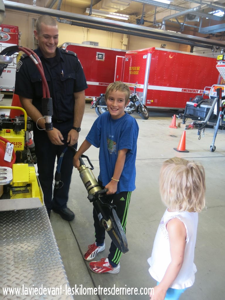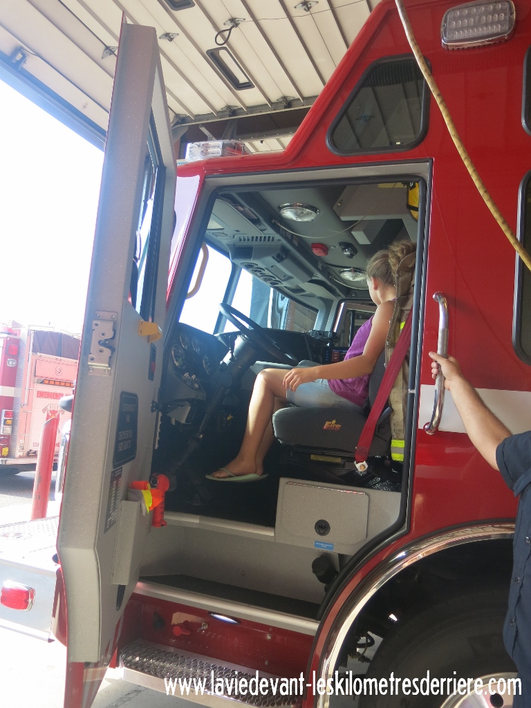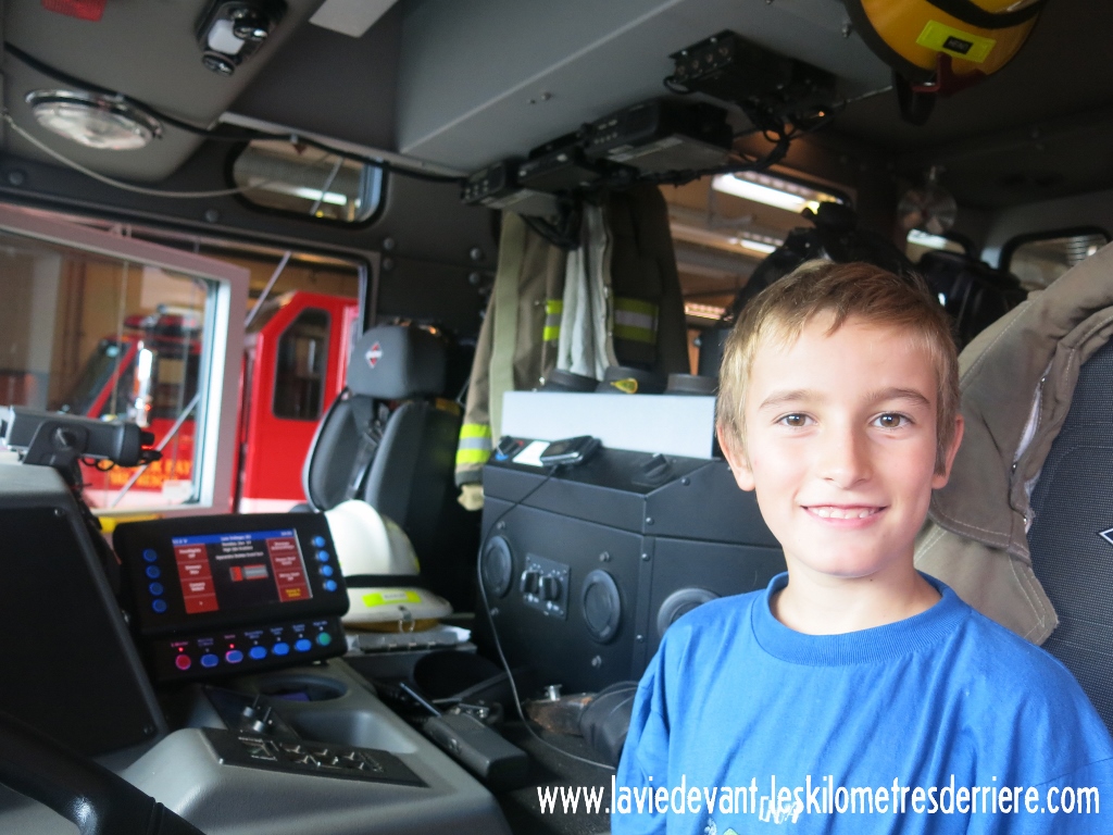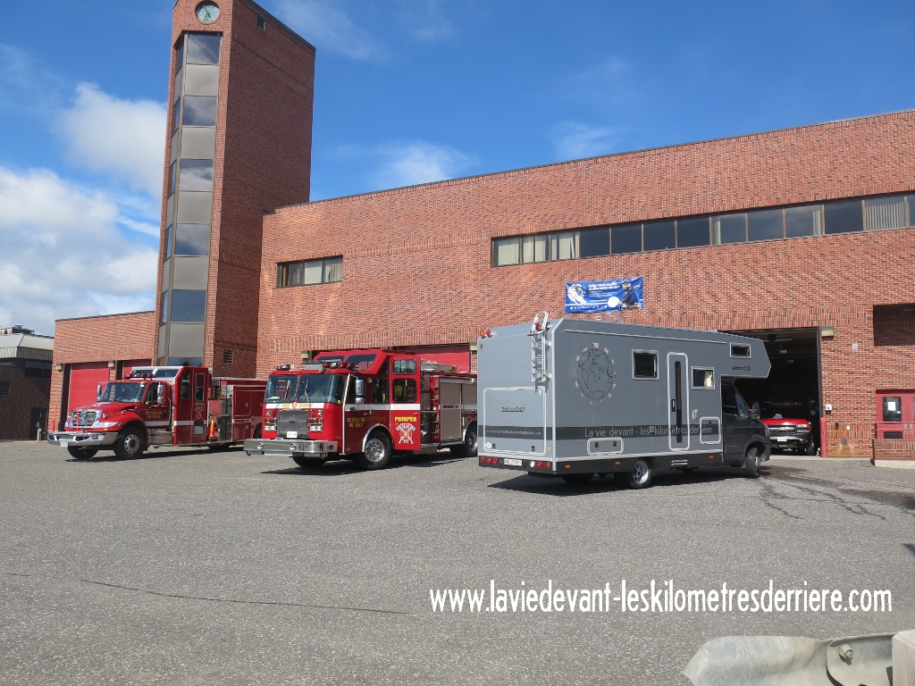 17.08 A Thunder Bay, avant de partir, nous devions remplir le réservoir d’eau de notre Rhino. En roulant un peu dans la ville, Claire aperçoit une caserne de pompier et me lance à ce moment : « c’est un bon endroit pour chercher de l’eau » ! Dans ma gêne habituelle dans ces moments-là (oui ça m’arrive d’être timide) je lui dis qu’on n’allait pas oser demander comme ça. Et bien si, madame y est allée et nous avons été accueilli comme de roi ! Les enfants et Claire ont eu droit à une visite de tout le camion flambant neuf ainsi que des explications aux milliers de question de Jimmy, ainsi une démonstration de la descente d’un pompier sur la barre métallique.