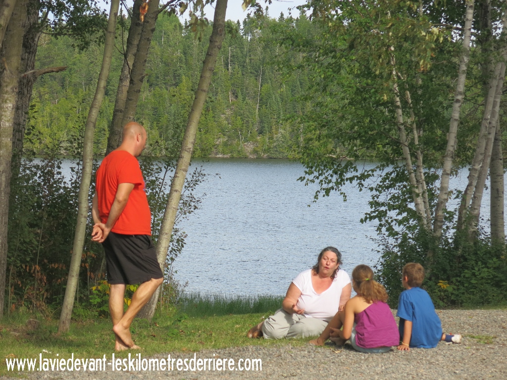 Sur la route pour Kenora, nous avons trouvé une jolie petite plage pour y pique-niquer et faire une petite sieste. Un peu plus tard, lors d’un autre arrêt pour les 4h, nous avons rencontré Larissa, une française établie au Canada depuis de nombreuses années et apparemment toujours prête à raconter plein d’histoire pour le plus grand plaisir des enfants qui ont beaucoup ri !