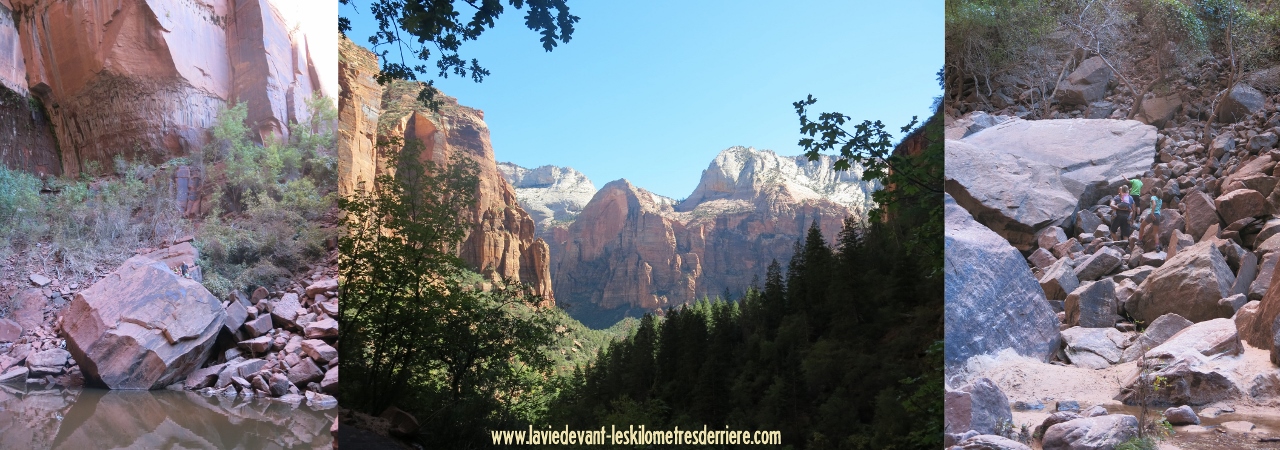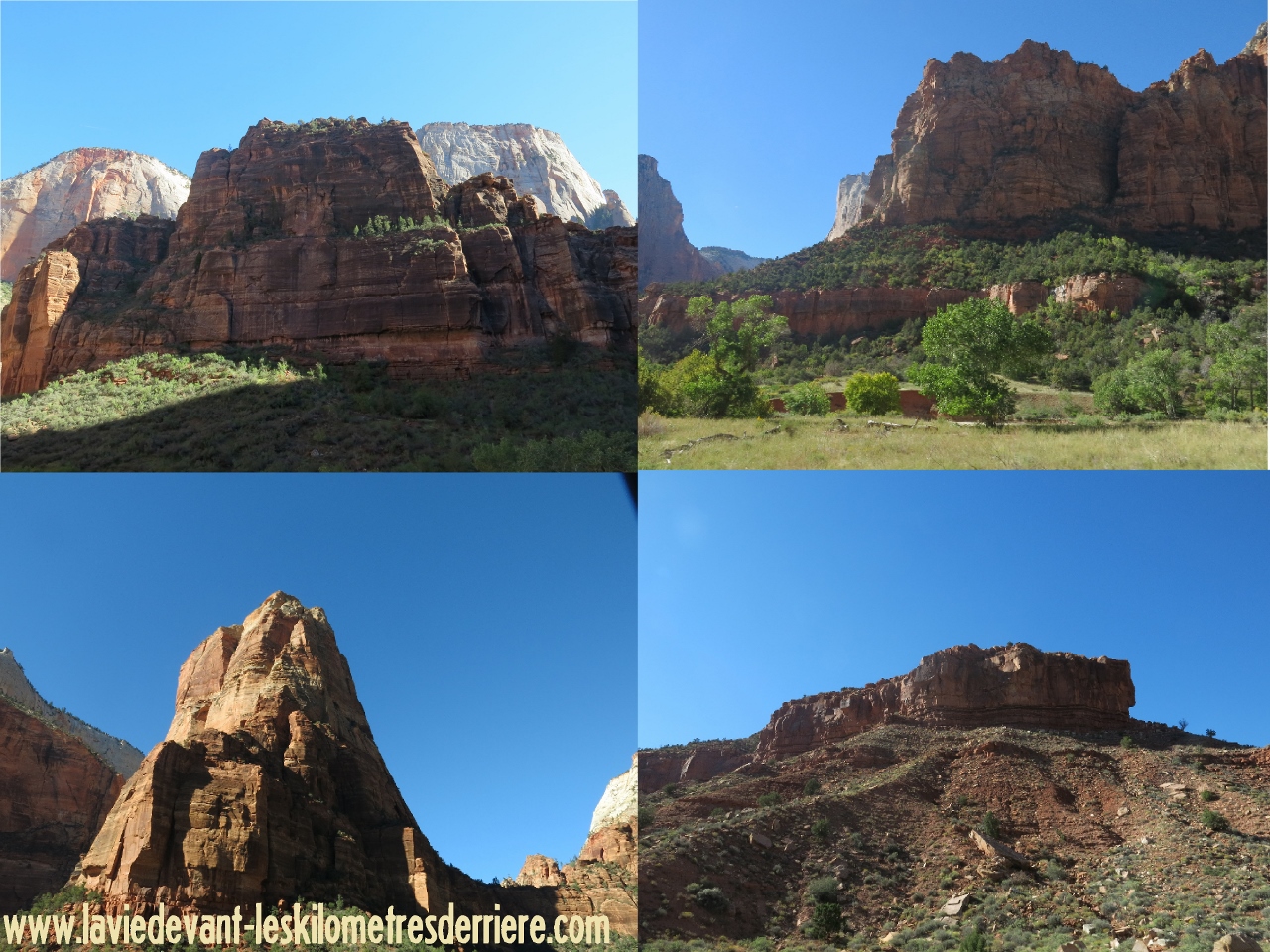 Donc, le dimanche matin, nous sommes allés au South campground et avons trouvé un bon emplacement, à quelques pas de la rivière. Nous nous sommes installés et avons préparé les affaires de randonnée. Nous sommes partis faire le sentier des Emerald Pools en prenant un shuttle du parc. L’organisation des transports est vraiment bien faite. Il y a un bus toutes les 5 minutes avec audiodescription des endroits traversés. Tout du long du voyage, vous en prenez plein les yeux. Voici quelques photos prises simplement par la fenêtre du bus.