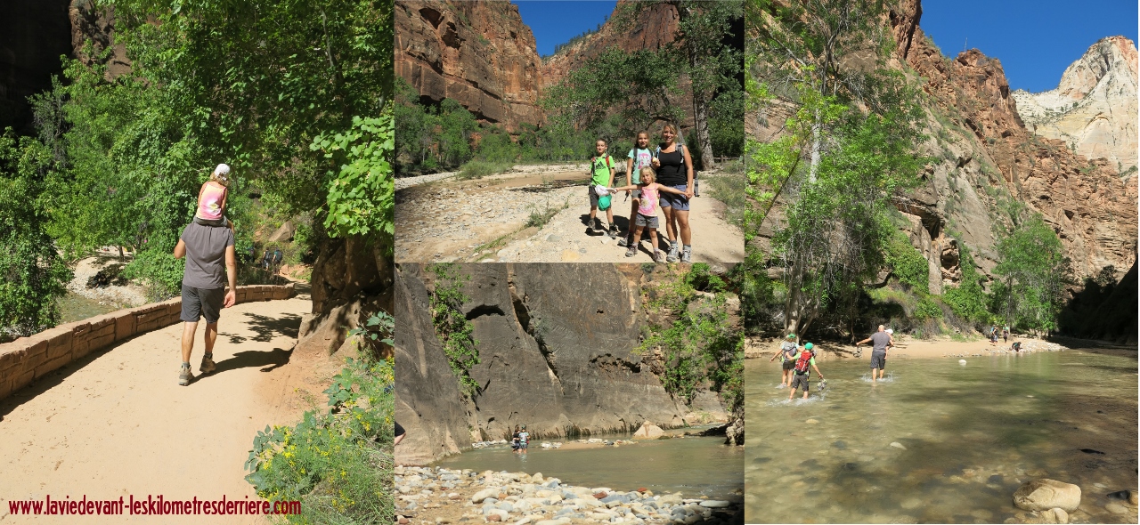 Une fois la marche des Emerald Pools terminée, nous sommes allés faire celle de Narrows. Bien plus touristique (le chemin est en béton), elle longe la Virgin River et finit lorsque les parois du canyon se resserrent. Il est possible de continuer mais pour cela il faut marcher dans l’eau. Nous avons remonté un bout de la rivière mais Jimmy, Amélie et moi avons fait demi-tour après 10 minutes. Claire et Soraya ont continué un bon bout et son réellement rentrées dans les Narrows.