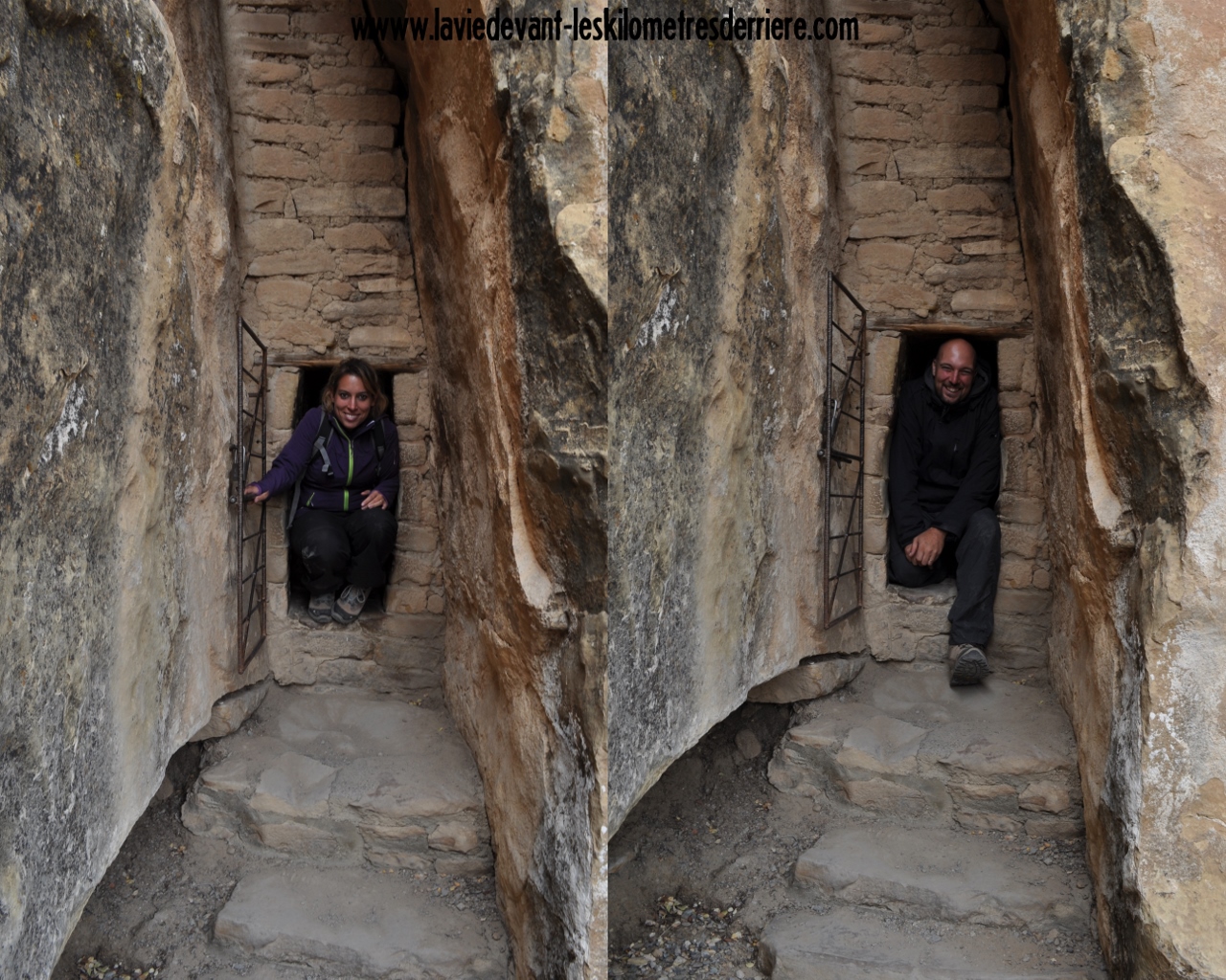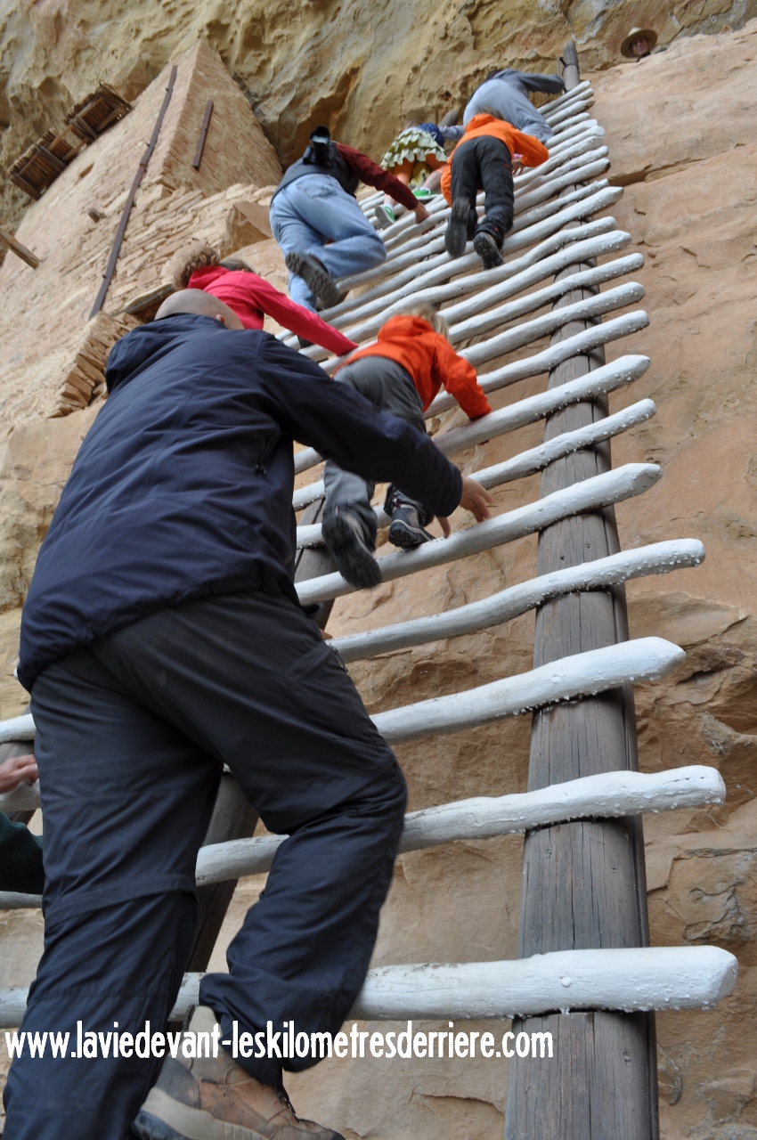 Cela terminé, nous avons débuté la visite. Tous ces villages sont construits dans des espèces de grottes créées par l’effondrement de la pierre de sable suite à l’infiltration d’eau. La Ranger nous en a expliqué la formation et le fait que cela continuait encore aujourd’hui, mettant en péril certains édifices. Nous sommes montés dans le village par cette grande échelle de 10m. Au 2/3, Amélie, sans se retourner, me dit : « ça va pas, j’ai un peu peur ! ». Le ton utilisé semblait plus être une plaisanterie qu’une réelle peur. Mais je me suis collé à elle, dans son dos et lui ai demandé si cela la rassurait. Elle répondit que oui et continua.