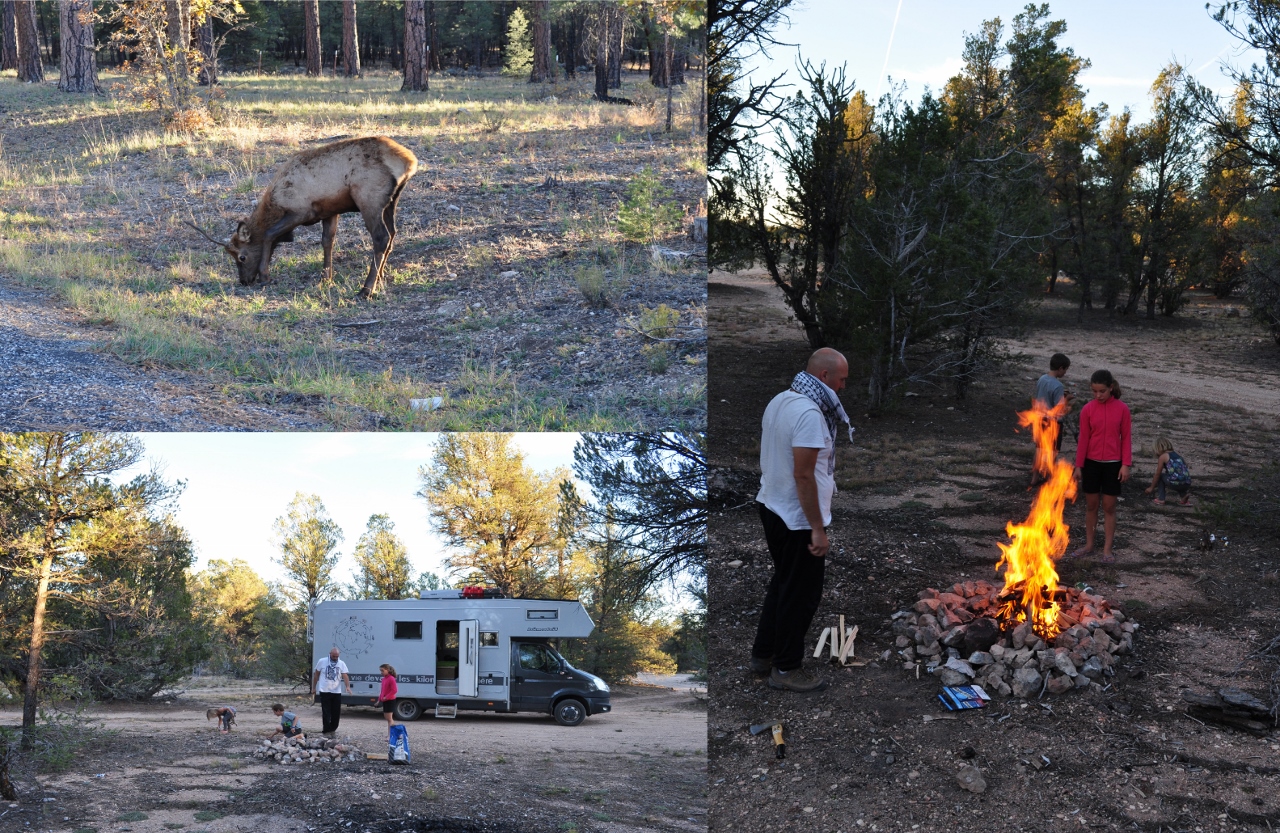 Ensuite, dans l’idée de rejoindre Meteor Crater le lendemain, nous avons roulé une quinzaine de miles en direction de Williams puis avons fait halte dans le National Forest de Kaibab, la même qui se trouve de l’autre côté du parc où nous avions dormi hier. Mais cette fois-ci, nous étions installés à 16h30. Nous avons donc fait un bon feu de bois, ramassé par les enfants, et avons grillé nos hamburgers !