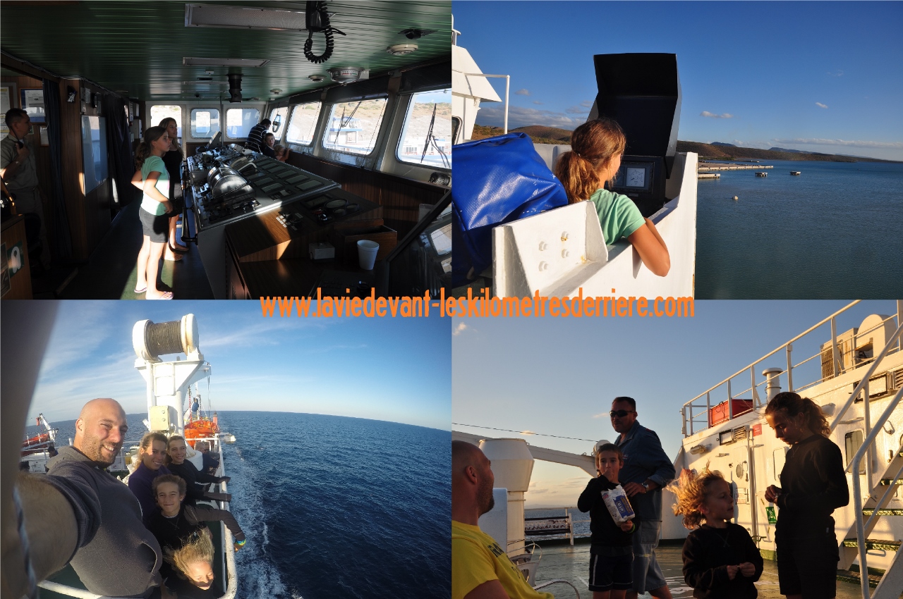 Nous avons quitté la péninsule de Basse-Californie, samedi matin, en prenant le ferry de chez TMC à Pichilligue. La traversée fût une source d’excitation pour tous et aussi de belles surprises. L’idée de prendre un gros bateau et d’y dormir rendait les enfants heureux. De plus, lors du trajet, nous avons vu des dauphins suivre le bateau en sautant de partout. Nous avons également vu des baleines à bosses et leurs queues. Finalement, des poissons volants attaqués par une horde de frégates. La nuit, elle, a été un peu agitée et peu reposante, puis le réveil à 6h30 pour prendre le petit déjeuner servi jusqu’à 7h seulement. Pour tous les aspects pratiques, nous avons eu la chance de croiser Oscar. Chauffeur-livreur habitant Guadalajara, il connaissait déjà le système et nous a donné de nombreux conseils et a demandé au capitaine de nous montrer son poste de navigation, merci à lui. De plus, il est très sympathique, a offert des Pop-corn aux enfants et nous avons beaucoup discuté avec lui lors du souper que nous avons partagé.