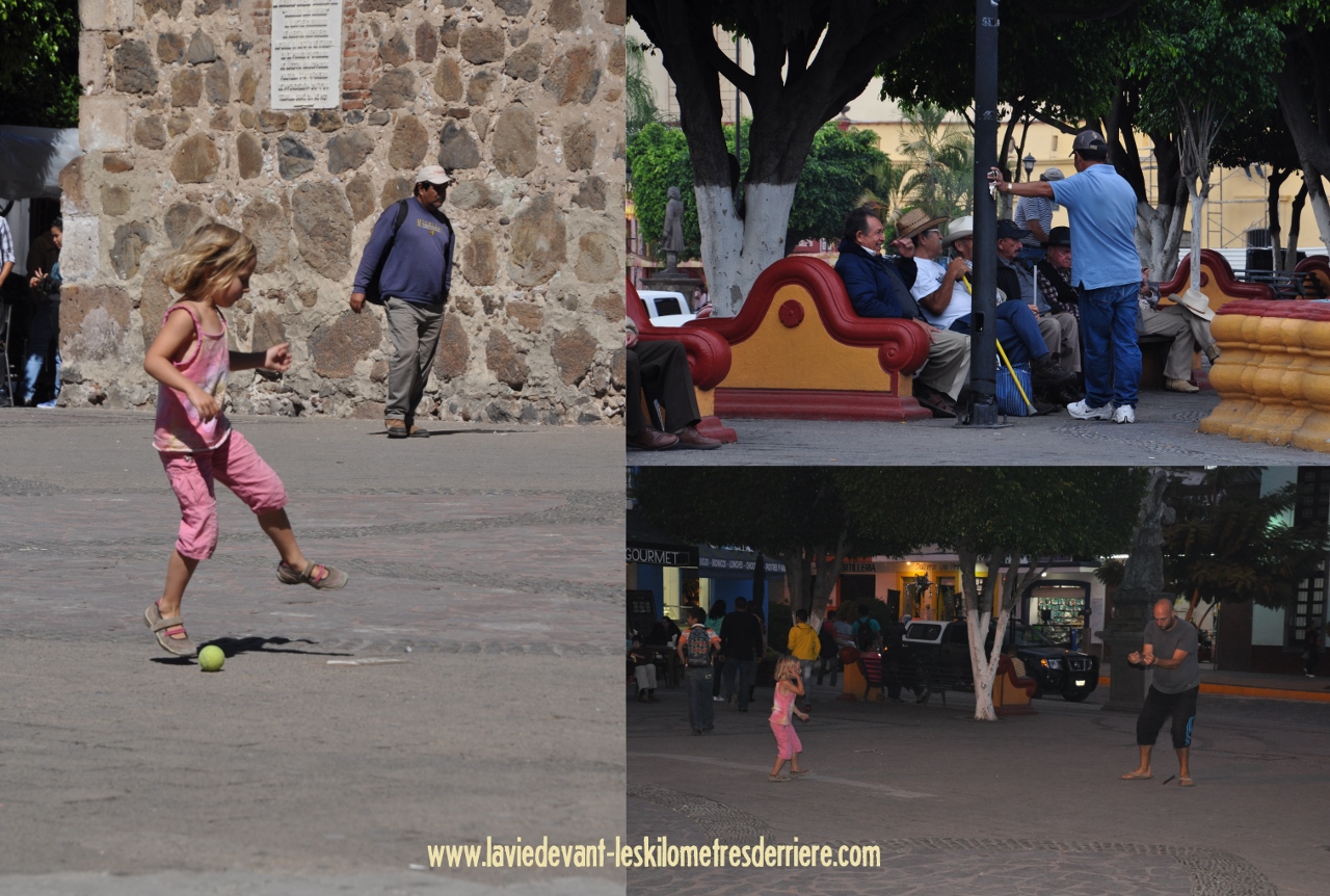 Nous avons roulé jusqu’à Tequila où nous pensions visiter une fabrique. Mais une rencontre nous aura fait changer nos plans. Il faut dire que nous ne sommes pas du tout amateur d’alcool fort et encore moins de Tequila, donc une distillerie est une distillerie et le prix de visite de 10Fr. par personne nous semblait une dépense inutile. Surtout que la place devant l’église Santiago Apostol est propice à passer du bon temps. Nous y avons passé toute notre soirée du mardi à y boire un verre dans un café de la place et jouer à la balle avec les enfants sous les regards intéressés des locaux, ponctué de quelques échanges en espagnole et ainsi rentrer enfin en contact avec la population mexicaine.