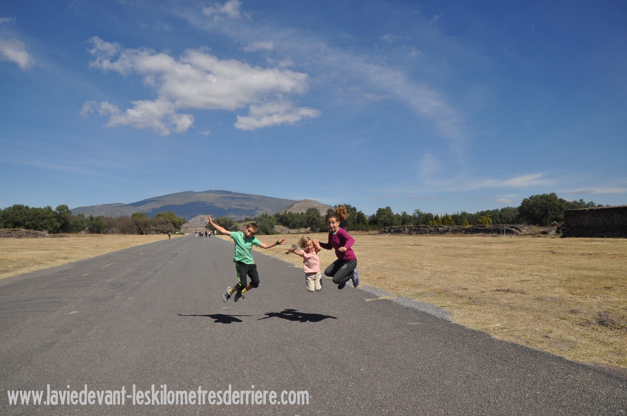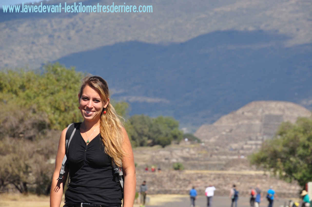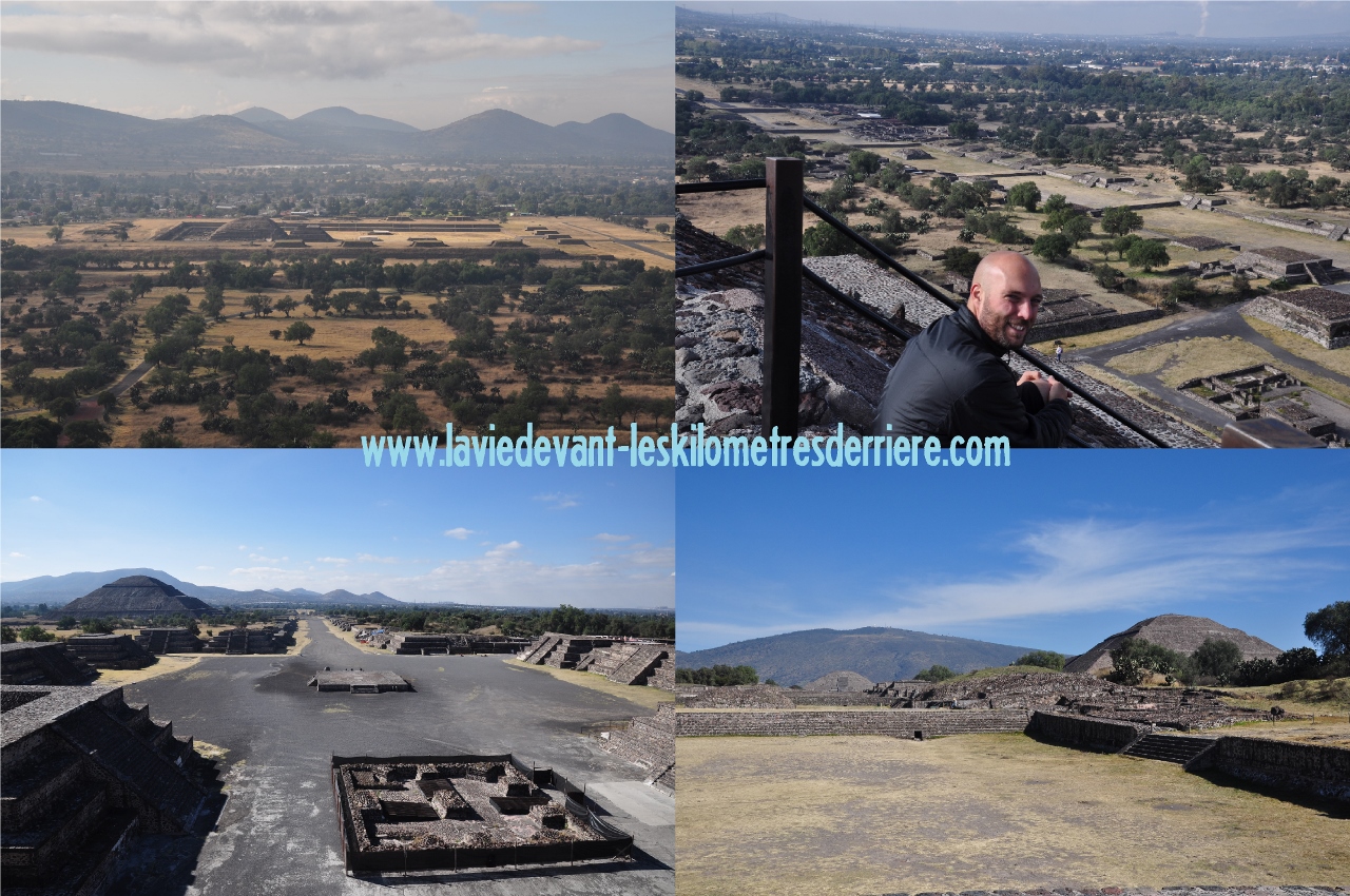 Sur le site, il y a 2 pyramides ; de la luna, del sol et le temple de Quetzalcoetl (Dieu Serpent à plumes), puis l’ensemble de la ville dont seul l’avenue principale a été ressortie de la terre.