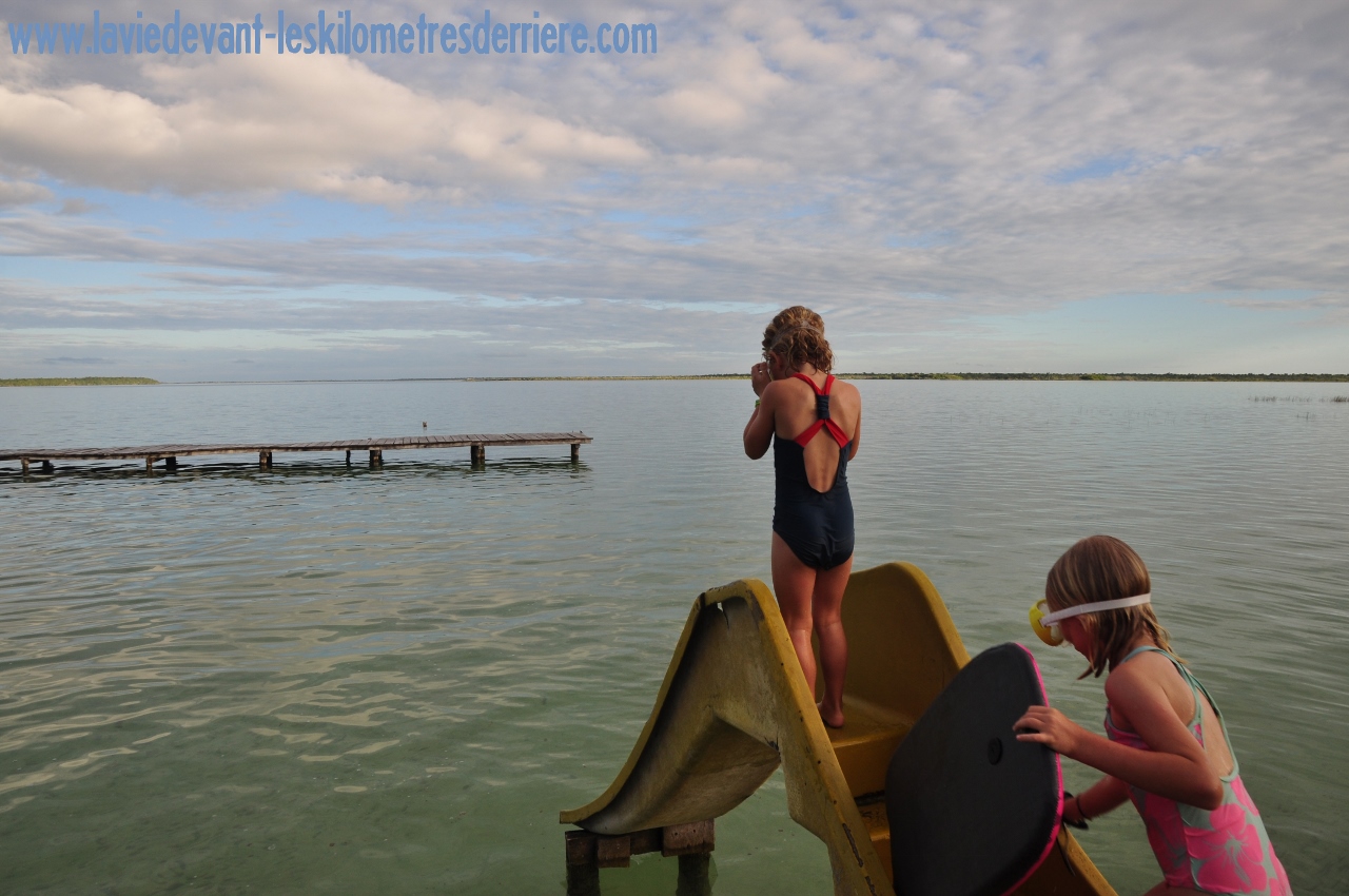 Puis, nous nous sommes rendus sur cette fameuse Laguna Bacalar. Surnommée la lagune aux 7 couleurs, elle est véritablement splendide. Nous avons, tout d’abord, passés une première journée à Buenavista. Tout le monde s’est bien amusé dans l’eau et le soir nous avons mangé dans une palapas avec moustiquaire !