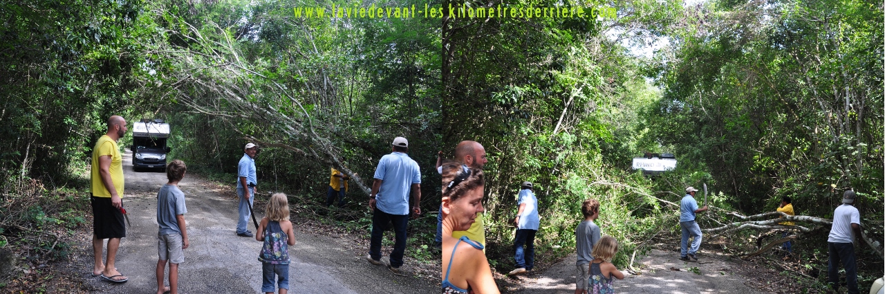 Mais le plus ennuyeux fût cette arches formée par un arbre et m’empêchant totalement de passer (les Joly, eux, sont un peu plus bas que nous). J’ai commencé à scier petit à petit le gros, puis suis monté sur le toit pour continuer le travail. Mais c’est là qu’un 4×4 avec des employés du site est arrivé par hasard. 4 hommes sont sortis munis de machettes. Après m’avoir fait reculer, ils ont mis 5 minutes à abattre l’arbre, puis 5 autres à nettoyer la route. Une efficacité redoutable et déconcertante !
