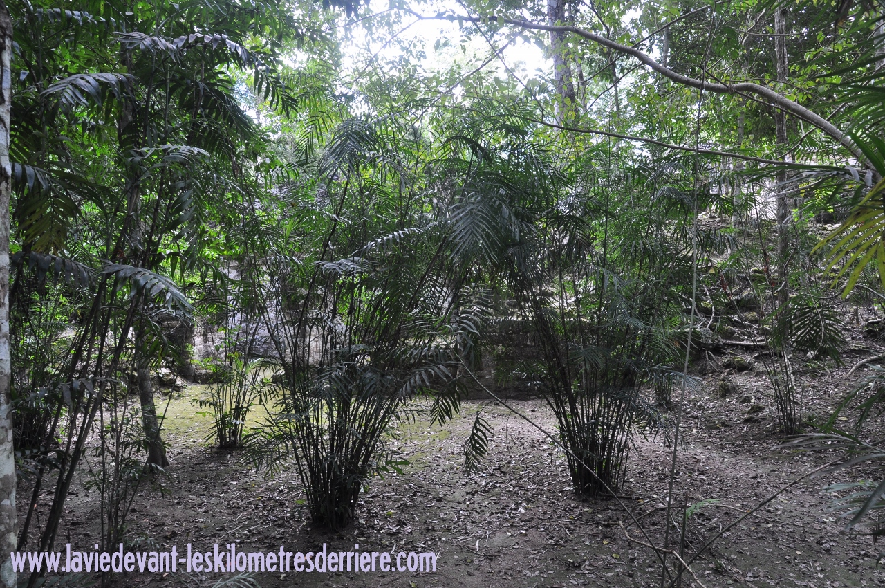 Le site de Calakmul, nous l’avons fait le jeudi. Nous nous sommes rendus, toujours en compagnie des Joly, dans la réserve de la biosphère de Calakmul mais non sans difficultés. La route est surplombée d’une végétation débordante et parfois assez basse. Nous avons dû jouer de slalom entre les branches, de freinages appuyés pour éviter les contacts trop violents, mais aussi de quelques coups de scie et de serpes pour dégager certaine branches trop grosses et trop basses.
