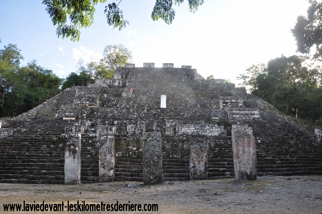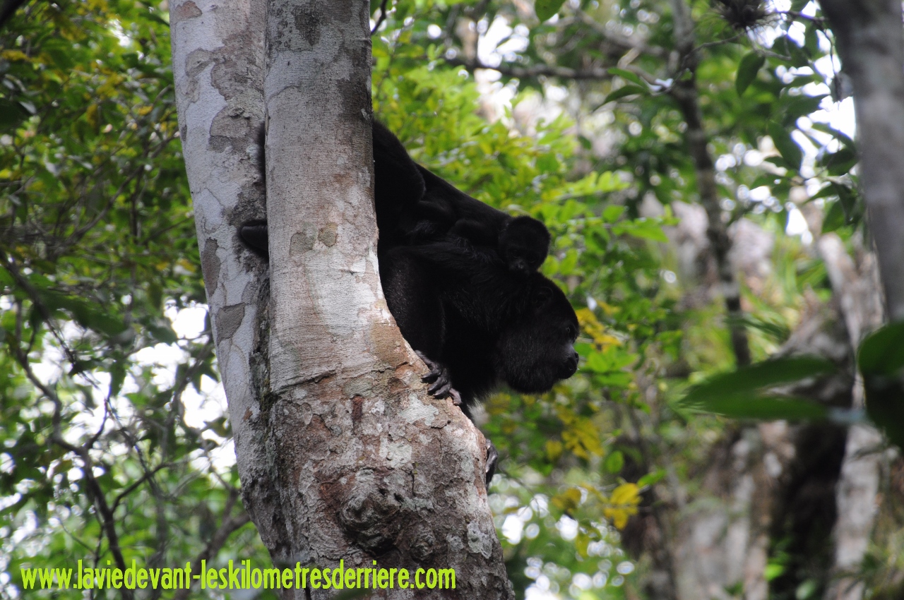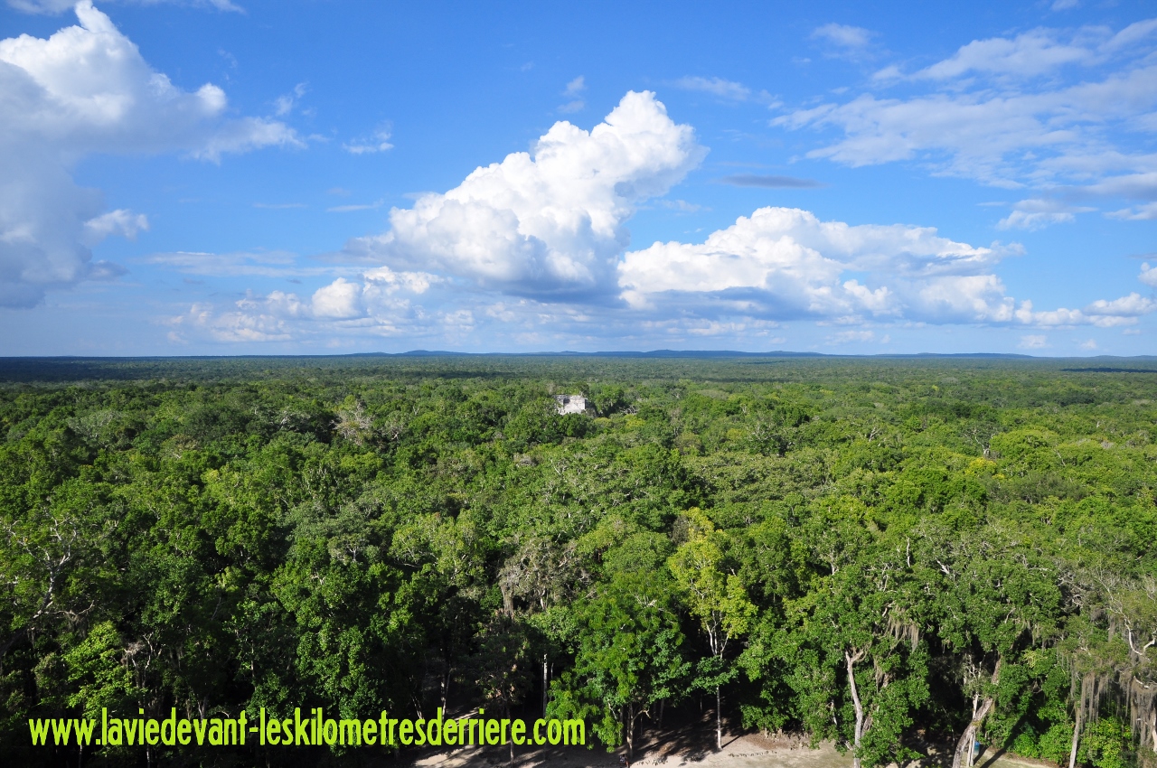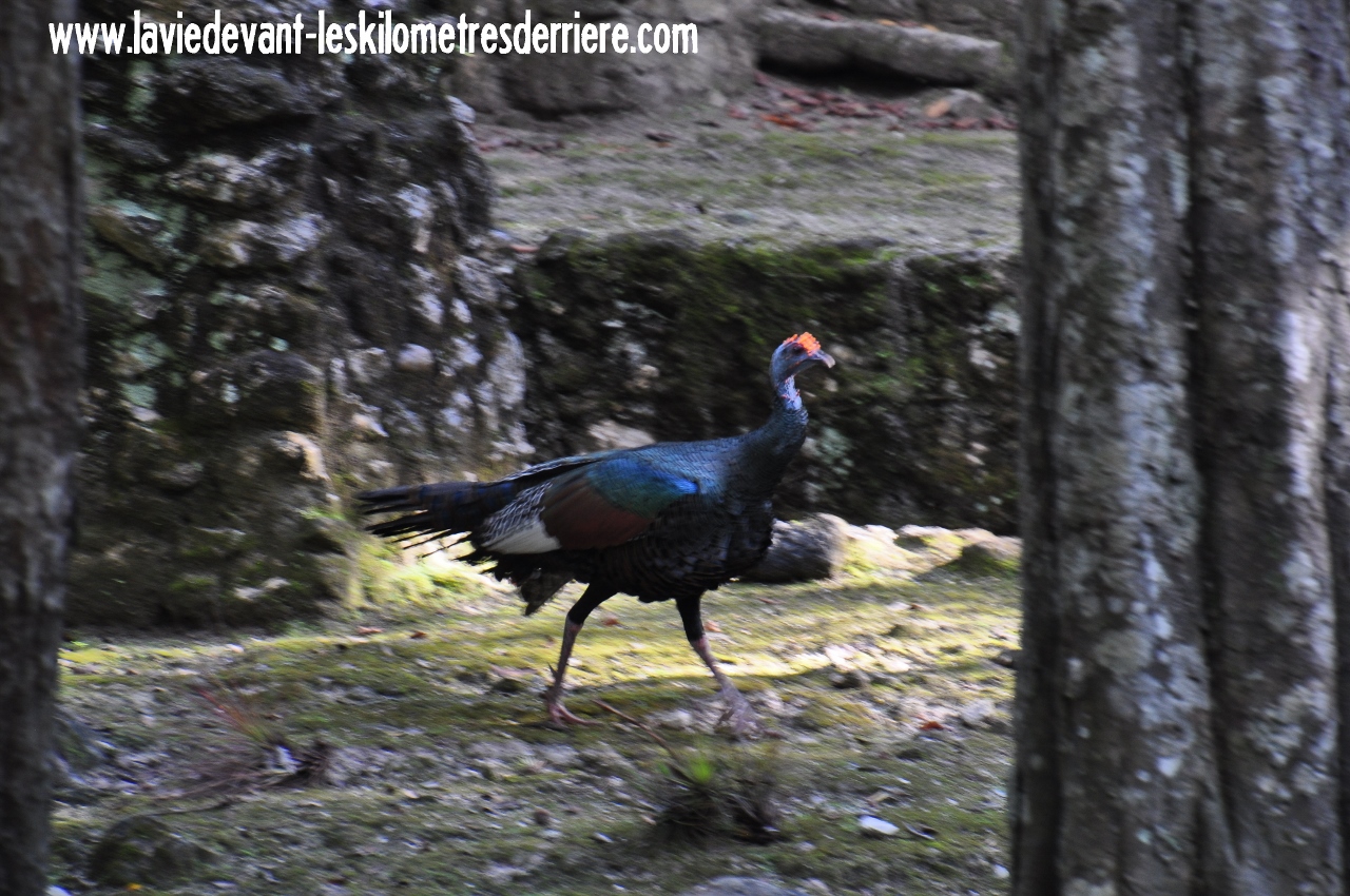 Mais le jeu en valait la chandelle. Le site de Calakmul est sans aucun doute celui où nous avons le plus pu être en contact avec la nature. Un site à ne pas manquer, bien qu’il soit hors des grands axes habituels et un peu compliqué d’accès, mais cela en fait aussi son charme. Si vous venez ici, ce n’est pas seulement pour ses ruines tout de même très belles, mais c’est pour son tout. Des ruines accessibles dans une jungle luxuriantes habitée de singes, oiseaux et animaux en tout genre (jaguar difficiles à voir, Toucan, Dindes sauvages, etc). Et comble du tout, vous en voyez beaucoup sans difficultés. Les pyramides, elles, offrent une vue superbe sur l’étendue de jungle l’entourant, et au Sud vous voyez le Guatemala…. Vraiment, nous sommes heureux (et le mot est pesé) d’être venus jusqu’ici !