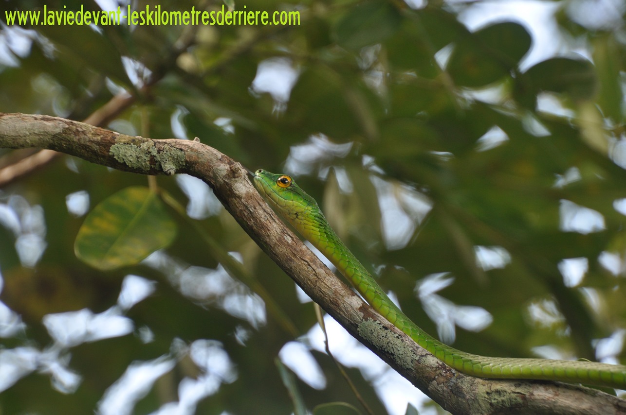 Et puis, au Mirador, nous y avons fait une rencontre assez surprenante. Là, à 1m de nous, un serpent (très dangereux et venimeux selon l’employé du parc) se baladant sur l’arbre à côté de nous. Petite anecdote stupide ; quand on dit que les touristes sont parfois aussi débiles qu’incultes, un touriste allemand s’est amusé à taper son bâton de marche contre la branche où se trouvait le serpent pour pouvoir prendre une belle photo… qu’espérait-il à part risquer des problèmes ? Attirer son attention comme avec un chien domestique et lui caresser le cou ?