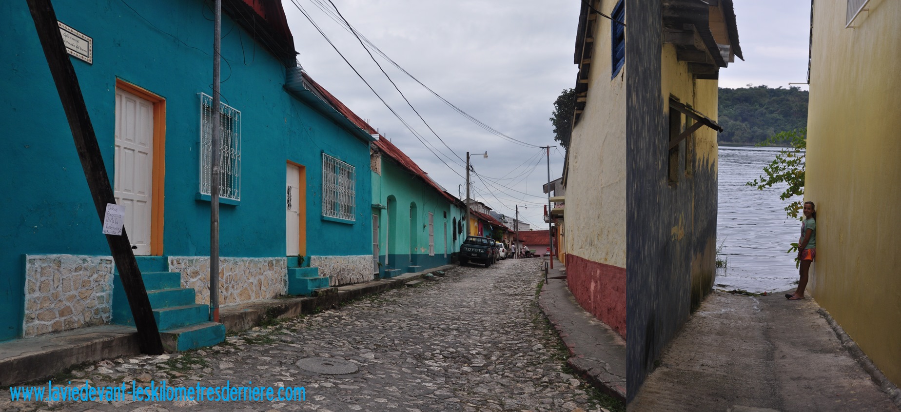 Le jour même, nous sommes redescendus à Flores. La partie de la ville juchée sur la presqu’ile est un vrai bonheur pour les yeux et le cœur. Son architecture et ses lignes sont plutôt jolies, puis les gens y sont souriants et accueillants, à l’image de cette famille qui nous a fait entrer pour nous expliquer ce que sont les cascarones qu’ils vendaient. Au Guatemala, pour fêter carnaval, ils confectionnent des coquilles d’œufs colorés, dont ils auront remplis l’intérieur de confettis puis refermés par une feuille de papier kraft. Le tout est à casser sur la tête de ses copains pour rigoler un peu ! Pour en revenir à Flores, le Lac Petén, qui l’entoure, voit son niveau monter de 3m chaque cycle de 50 années, puis revenir à son niveau normal en peu de temps. Ce phénomène cause la perte de la rue circulaire extérieure de la presqu’île sur 70% de sa circonférence. Cela ajoute un peu au côté mystique de cette ville puisque nous avons eu la chance que l’année 2015 soit à l’apogée de ce cycle !