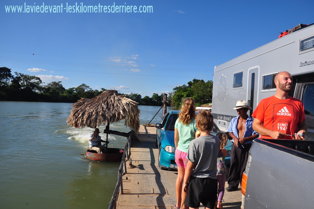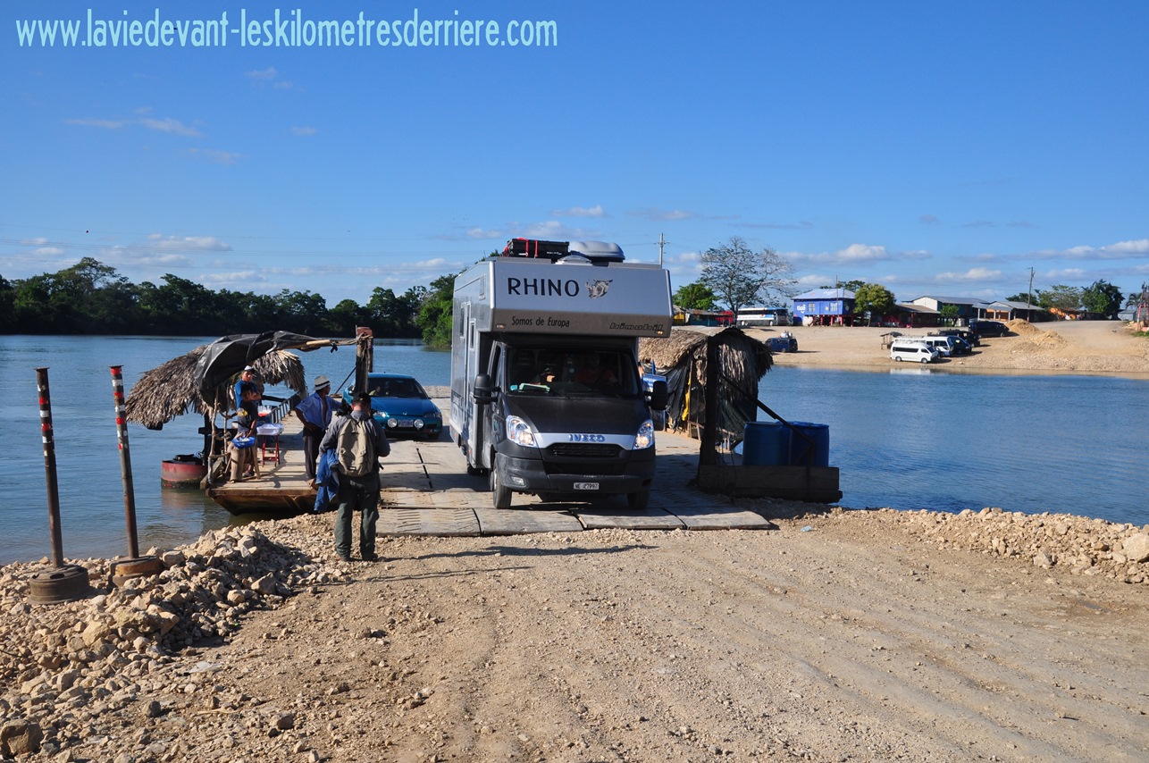 Nous avons quitté le site, en début d’après-midi, pour nous diriger contre le Sud afin d’atteindre Lanquin. Nous savions que ne pourrions pas l’atteindre en un après-midi de route, car celles-ci ne sont pas dans un état de première fraicheur et il faut parfois emprunter des itinéraires peu habituels pour nous, comme ce bac pour traverser la rivière, poussé par un seul moteur de zodiac !