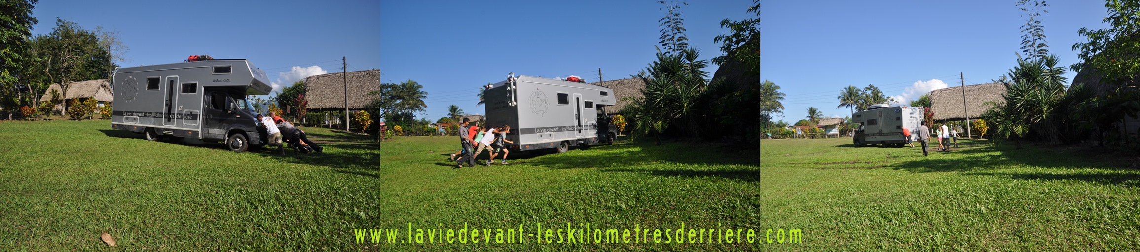 Le soir, nous avons eu une petite surprise et ne pensions pas avoir tant de difficulté à trouver un bivouac. Nous avons commencé à chercher vers 16h30 pour ne trouver le premier endroit que vers 17h15. Cette région Nord du Guatemala reste assez peu développée et les villages traversés semblent ne pas connaître l’utilisation journalière de véhicule. De ce fait, très peu de place sont accessible. Et celle que nous avons trouvé n’a pas été convaincante… Arrivés sur la place de l’école, juste à côté de la place du village, il s’y trouvait beaucoup de monde. Tous les regards se sont tournés vers nous, est plusieurs groupe de personnes, âgées comme jeunes, pour nous fixer d’un air intrigué. Nous avons d’abord trouvé cela rigolo en nous disant qu’un contact allait se faire. Ce ne fut pas le cas et, au contraire, après 45 minutes sur place, nous nous sommes vu demandé de l’argent pour que l’on nous surveille afin qu’il ne se passe rien ! Gloups… fonctionnant à notre instinct, Claire et moi avons décidé de repartir malgré la nuit quasi tombée.