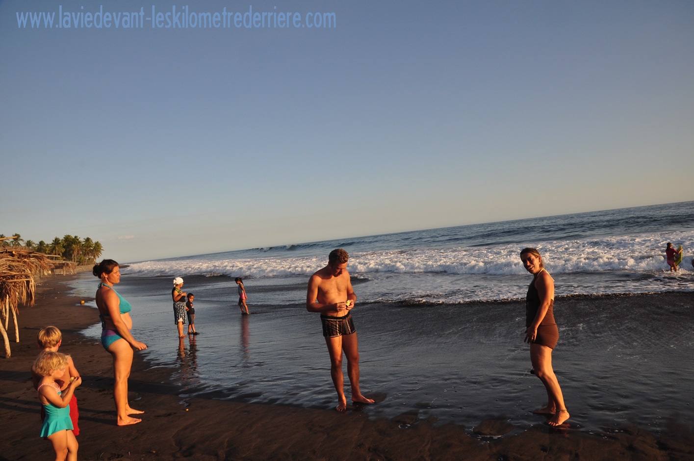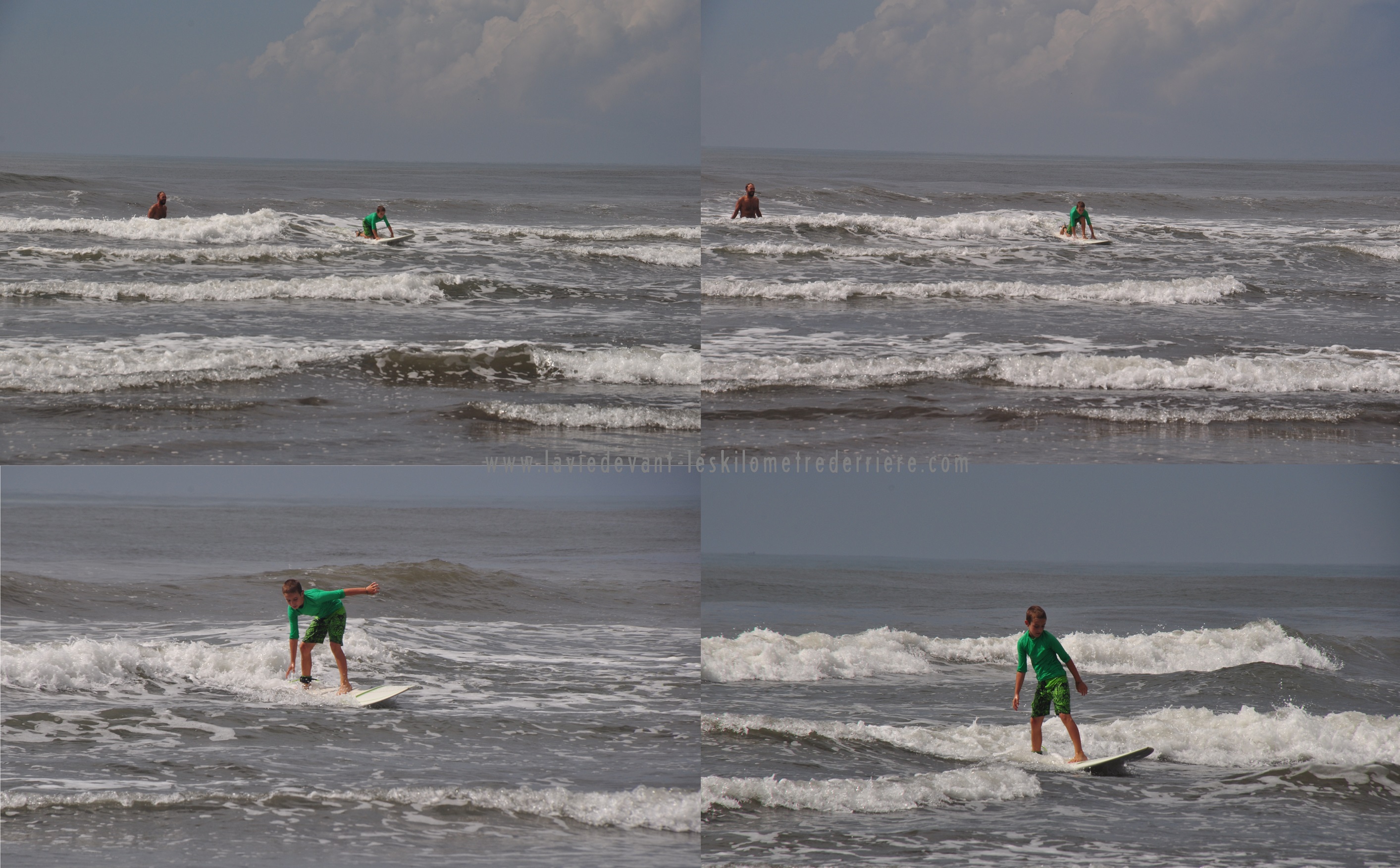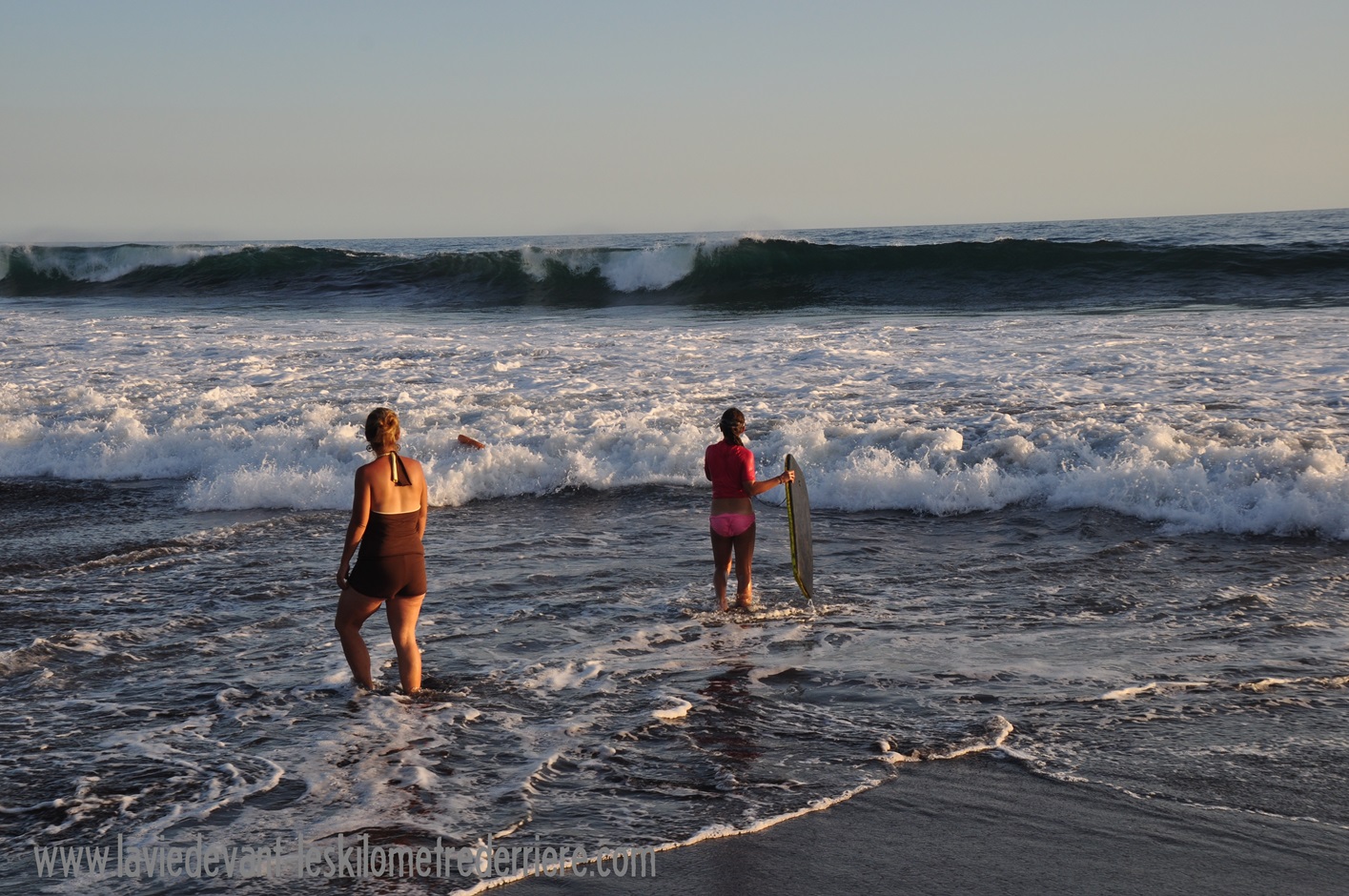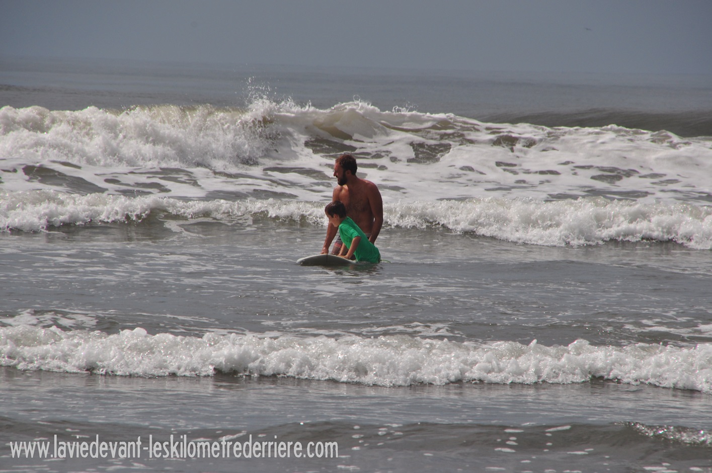 Mardi matin, nous avons repris nos routes et, nous, nous sommes partis en direction de El Cuco. Nous savions que Deny et Su, avec qui nous avons fait une partie du Belize, devait se rendre là aussi. Il était prévu que Jimmy prenne un cours de surf avec lui. Arrivés là-bas, sans avoir prévu de se retrouver quelque part, nous nous sommes tombés dessus en nous croisant sur la route. Nous avons cherché un bivouac ensemble et sommes arrivé à la Tortuga Verde, un hostal tenu par un gringo coincé dans ses années hippie, mais du bon côté ! Ici, tout est propre, bien rangé, bien entretenu et le service très correct. Le seul hic, nous avons dormis à l’extérieur du site car une grosse branche à 3m du sol nous bloque l’accès de l’entrée une et du sable mou sur une longueur de 5m nous empêche l’accès de l’entrée deux. Peu importe, nous avons profité à fond de notre soirée du mardi et notre journée du mercredi. Piscine (propre cette fois-ci), plage, surf, apéro, et re surf pour Jimmy ! Deny fut surpris par son aisance sur une planche. Nous qu’à moitié, car nous savons Jimmy à l’aise dans ce genre de sport, comme le fait de réaliser des sauts à ski après 3 jours sur des lattes ! Mais en tous les cas, ils ont pris les deux du plaisir. Deny pour transmettre son savoir, Jimmy pour glisser sur la vague…