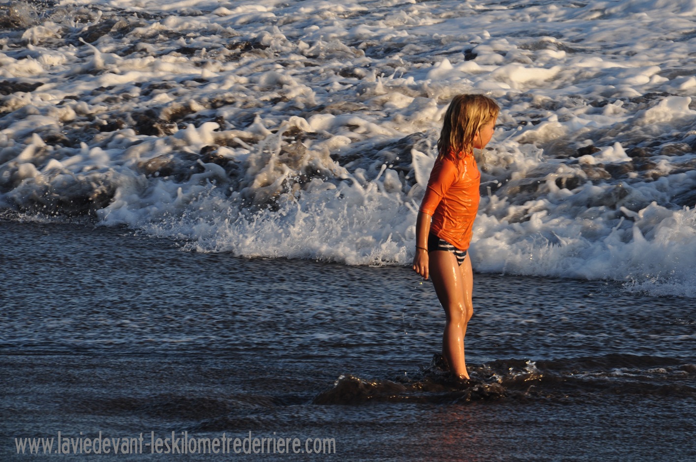 Donc, à El Sauzal, les enfants en on profiter pour passer leurs journées dans l’eau, parfois en compagnie de deux enfants belges dont les parents voyagent en bus VW westfalia. Nous avons passé deux nuit ici et passé pas mal de temps à discuter avec eux, Christophe et Nele. Lui, il m’a prêté son convertisseur 110/230V que nous n’avions pas pris avec depuis la Suisse. Nous sommes autonome à 80% (4 à 5 jours sous 35°C pour vider la batterie lorsque les panneaux peuvent êtres idéalement exposés) mais devons avouer que l’exposition constante de Rhino au soleil nous donne des chaleurs parfois à la limite du supportable au moment de dormir. J’ai voulu acheter un convertisseur plus tôt, mais impossible d’en trouver une fois passé les USA. Alors quand Christophe m’a donné deux adresses pour en trouver, j’ai voulu essayer le sien d’abord. Nous avons donc pu passer tout le lundi à l’ombre, le frigo tournant, et les batteries pleines. La seule remarque fut sur la puissance prévue du convertisseur. Il a pris un 200W suffisant à son Westfalia, mais l’appareil à très vite chauffé pour notre Rhino. J’achèterais donc un 500W. Mais merci à eux pour cet essai concluent et pour les adresses… bon voyage contre le Nord et bon retour en Belgique en avril.