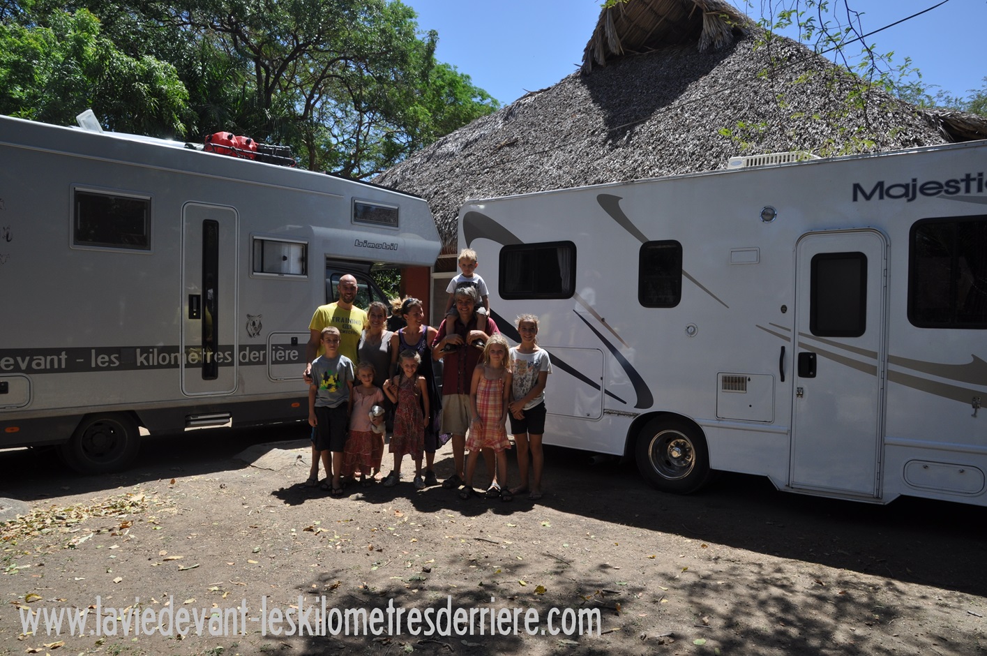En décembre 2014, nous avions fait une halte à San Cristobal de las Casas, au Mexique. Nous y avions croisé la famille Roveda, de la région de Thurgovie en Suisse. Nous étions restés en contact afin de nous recroiser. Et bien c’est chose faite. Ils sont déjà descendu jusqu’à Panama et remontent maintenant vers les USA. Nous les avons retrouvé en dessous de San Rafael del Sur, au bord de la mer, l’espace d’une soirée. Nous nous sommes échangés plein de bonnes adresse pour la suite de nos routes et parlés de ce qui c’était passé en 3 mois ! Les choses changent vite et spécialement les itinéraires de chacun… Personne ne fait l’itinéraire comme il en a discuté 3 mois avant, et c’est tant mieux. C’est une preuve de liberté et d’ouverture, laisser la possibilité de faire autrement. Nous n’avons passé que 20h avec les Roveda, car, sur leur conseil, nous avons repris la route pour La Flor et sa plage aux tortues. Merci à eux pour ce conseil et se fut agréable de les revoir, que les enfants puissent jouer ensemble avant que nous ne repartions chacun à l’opposé, une vers le Nord et un vers le Sud.