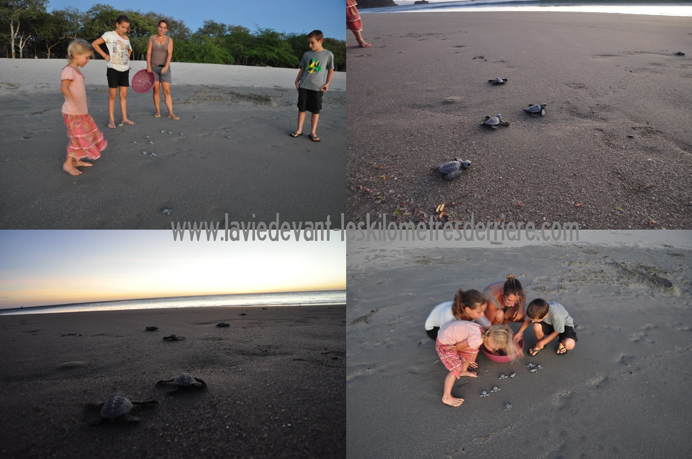 Le lendemain matin, avant de partir, nous refaisons un saut dans le refuge. La, plus d’une vingtaine de bébés venaient de naitre. Une belle dernière image pour les enfants émerveillés par ces petites carapaces.
