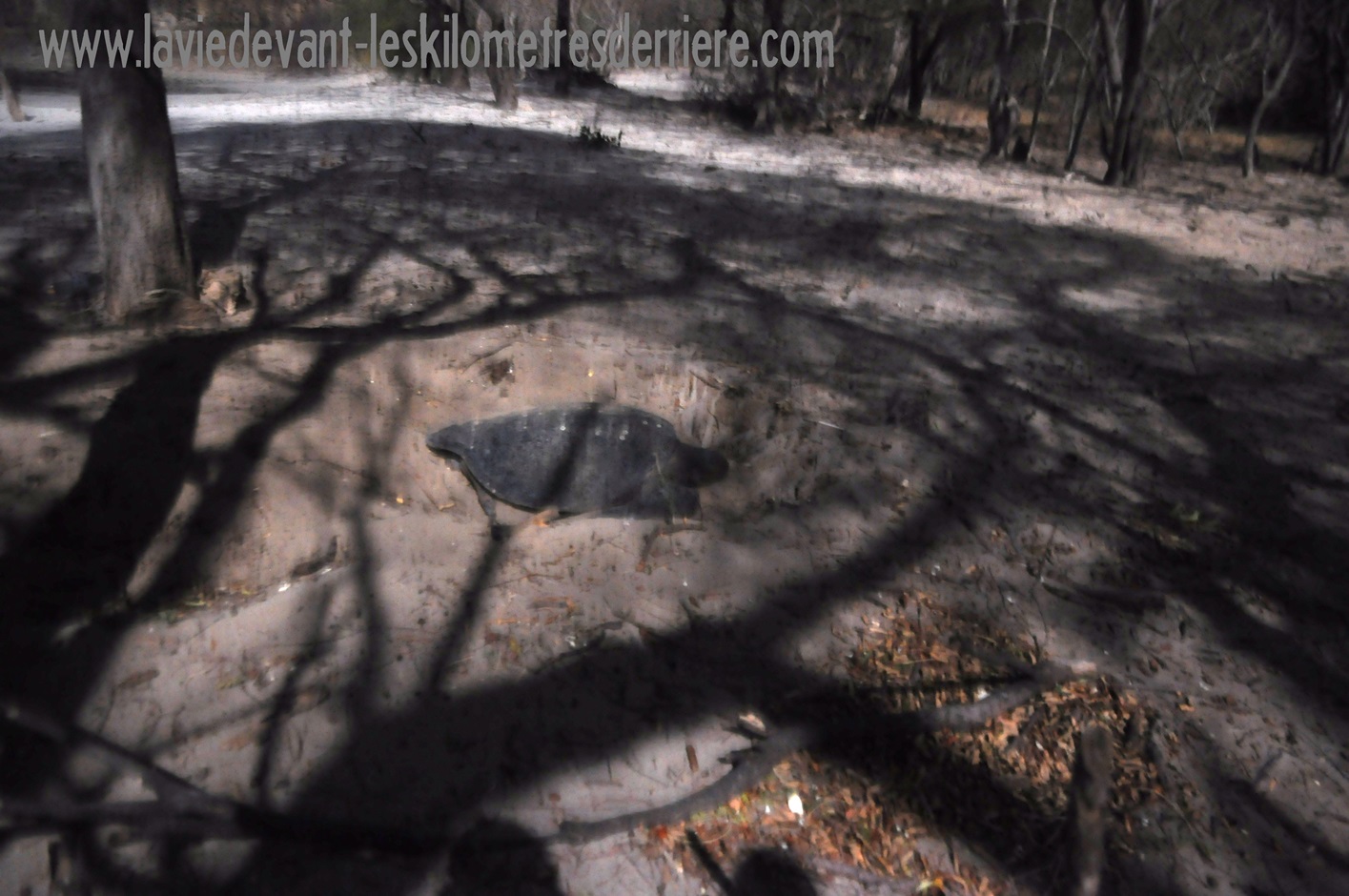 En partant ensuite nous coucher, le gardien nous propose de venir toquer à Rhino si une tortue adulte devait venir cette nuit sur la plage pour pondre. Ce n’est pas une certitude car dès fin février elles ne viennent plus en groupe, mais individuellement et pas toutes les nuits. A 23h pile, une personne nous réveille et nous dit de nous rendre sur la plage. Nous y verrons une tortue verte creusé son trou, et tenter de pondre ses eux. Après une longue attente, la tortue semble ressortir lentement de celui-ci sans avoir pondu. Selon le gardien, la qualité du sable à l’endroit choisi par la tortue n’est pas suffisante pour la ponte, elle reviendra une autre nuit. Et nous, nous n’attendrons pas de la voir repartir car le vent souffle terriblement, encore et toujours, et le sable de la plage nous fouette à en faire mal depuis le début.