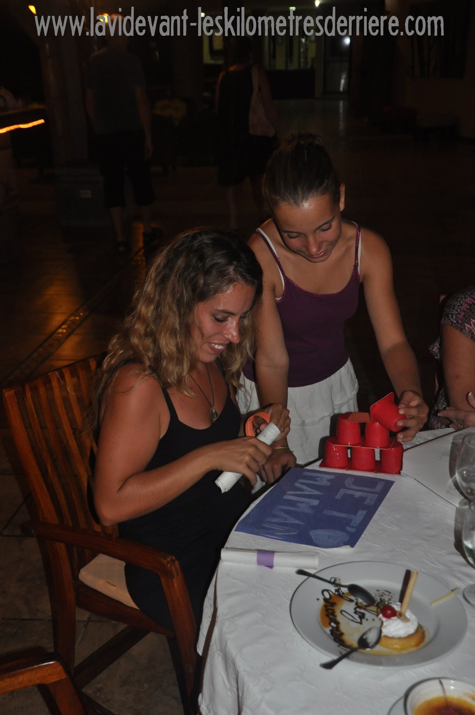 Puis, est venu le temps du dessert. Nous sommes remontés vers les enfants et avons dégusté de véritable douceur à l’européenne, avant l’ouverture des cadeaux, réalisés par les enfants ! Soraya a construit une pyramide de gobelets « petits suisses » avec un mot doux dans chacun d’entre-deux, à ouvrir quotidiennement durant une semaine. Jimmy et Amélie, eux, ont réalisé une sorte de calendrier de l’aven avec pour portes des lettres qui disaient : « Je t’ ❤ maman ». Et à chaque porte, un mot doux ou une surprise comme : « Je te fais un massage » ou « je te fais ton café ».