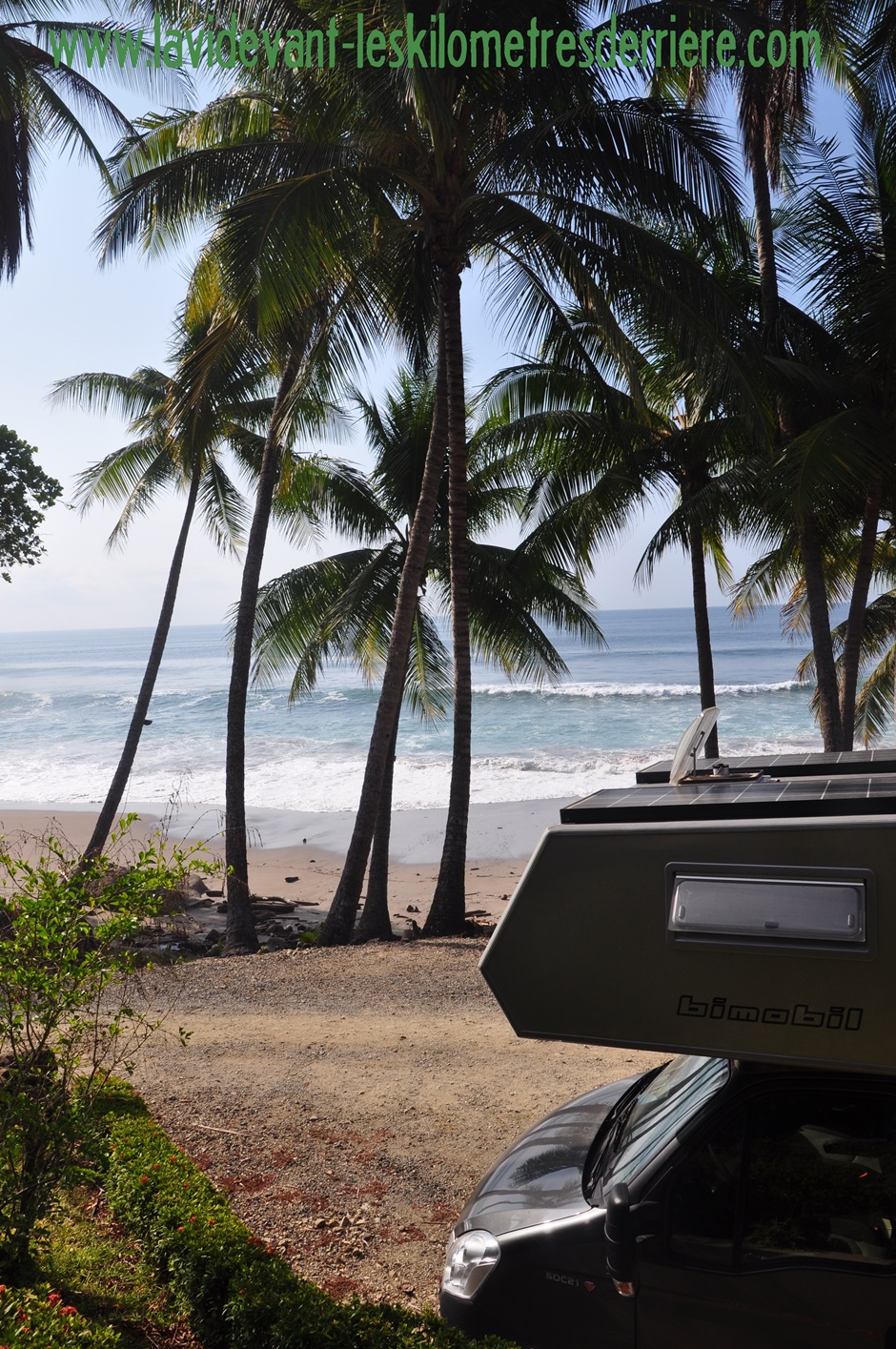 Après les 2 plages de Rajaba et Ocotal, nous voulions descendre un peu plus au sud de la péninsule de Nicoya. Nous avons fait route jusqu’à Montezuma en passant entre Naranjo et Paquera. Nous y avons fait la route la plus mauvaise depuis notre départ en tour du monde. Rien de bien horrible, mais parfois les dénivelés devaient dépasser les 12%, des crevasses importantes croisaient la route, des changements de niveaux soudains ont fait plier le support de la roue de secours (encore une fois) et la route était si poussiéreuse que nous avons vu un poids lourd déraper en descente en essayant de se freiner. Bref, notre premier vrai tout-terrain en Rhino !