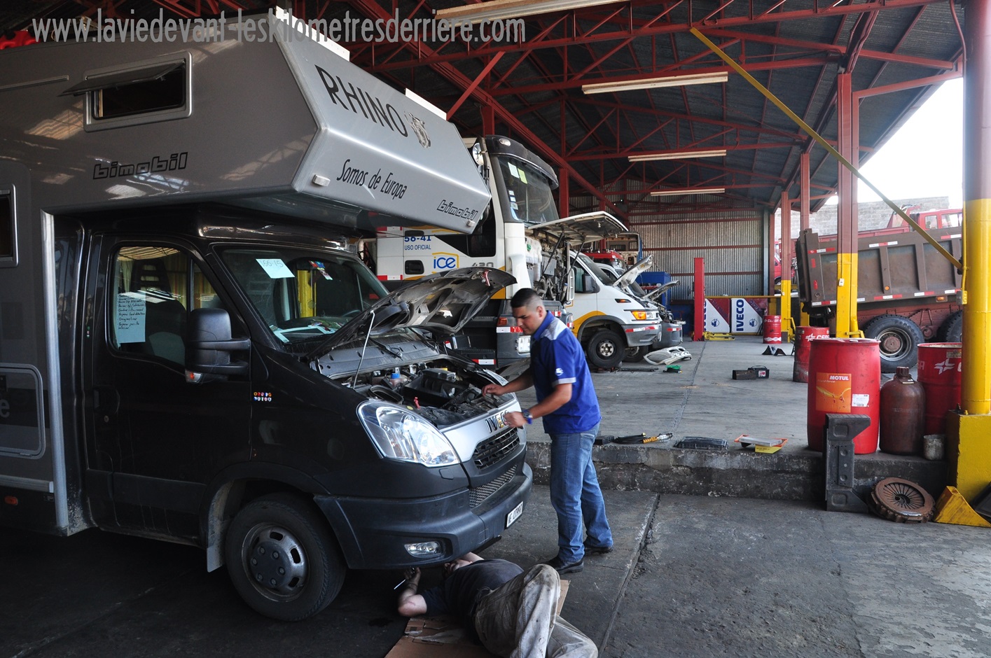 La raison pour laquelle nous sommes montés à San José est qu’il s’y trouve le seul garage Iveco des parties Centre et Nord-Américain. En plus, c’est un bon garage, sérieux et compétent avec toutes les pièces nécessaire (enfin presque). Nous avons dès lors fait le service des 40’000Km avec changement des 3 huiles (moteur, boite, pont différentiel). Pour l’huile de pont et de boite, heureusement qu’ils y ont jeté un œil, le garage des USA nous avait mis une mauvaise huile dans chaque et celle du pont avait même finit par mousser… ! Bref, nous avons remis Rhino en forme et régénéré son filtre à particule. Le tout, pris en charge très rapidement, servis comme des rois et pouvant profiter de ce qu’ils ont sur place comme les wc, l’eau, l’électricité et le wifi.