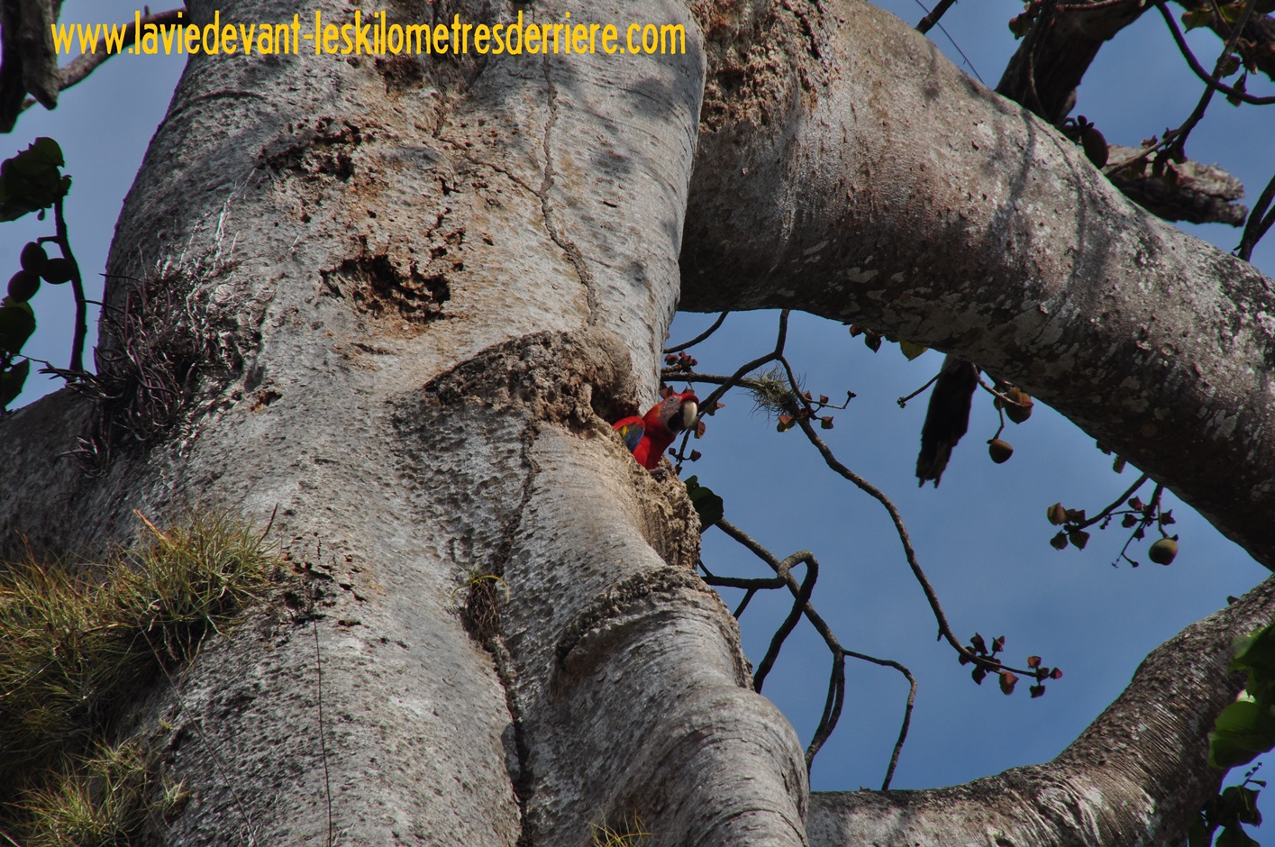 L’eau y est à 28° et se trouve être propice à de nombreuses heures de jeux et baignade pour petits et grands. Aussi, pas mal d’oiseaux comme des perroquets verts passent régulièrement dans les arbres sur l’arrière de la plage. Mais surtout, ceux qui auront été les vedettes pour nous, ce sont les Aras rouges dont un couple niche juste au bout du chemin carrossable de la plage, dans le trou d’un ceiba. Nous les avons vu voler à plusieurs reprises, puis les avons observé deux ou trois fois lorsqu’ils se posaient sur l’arbre suffisamment longtemps pour s’y rendre. Des moments magiques, remplis de joies et d’excitation, tant pour les parents que les enfants !