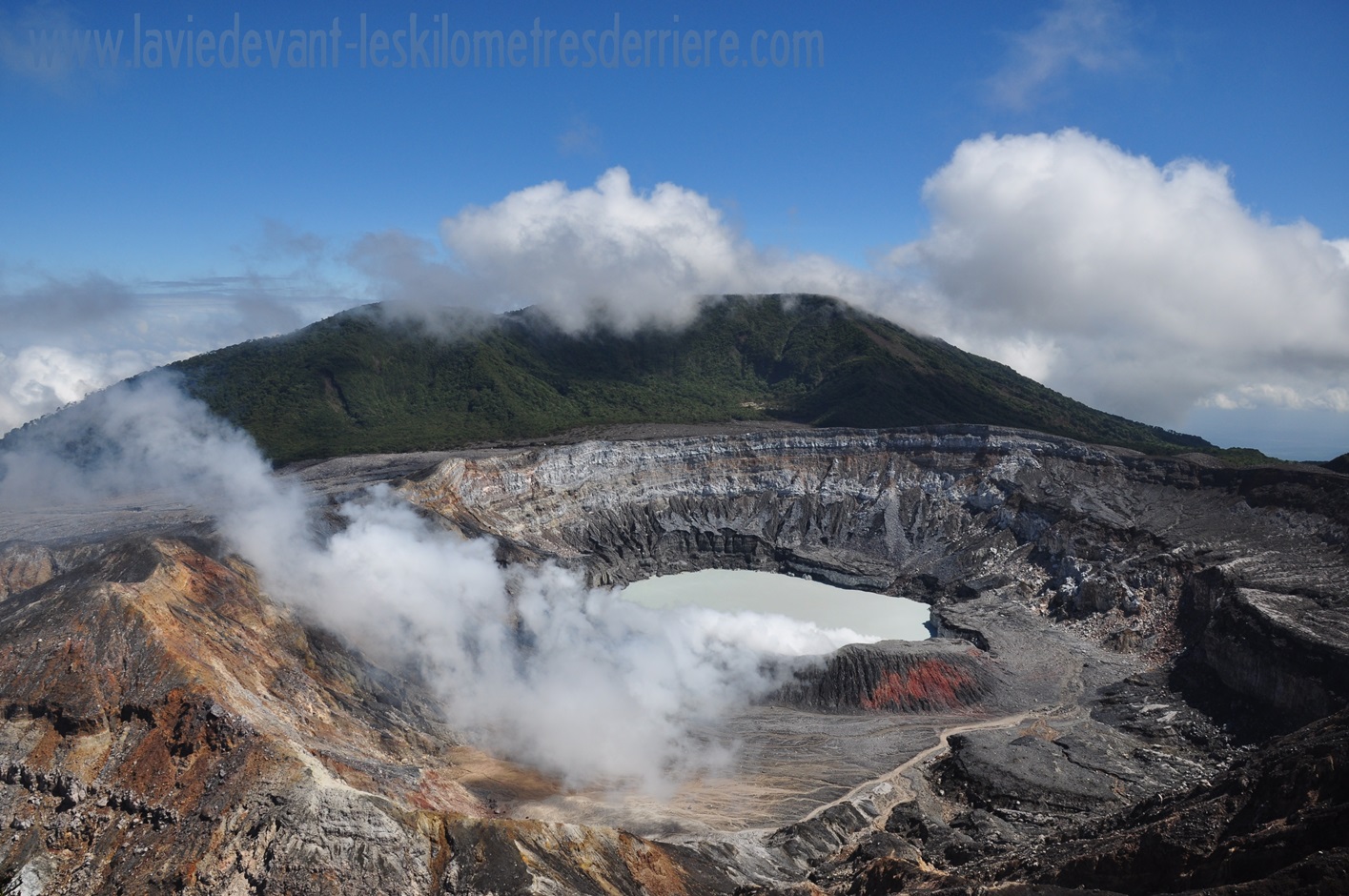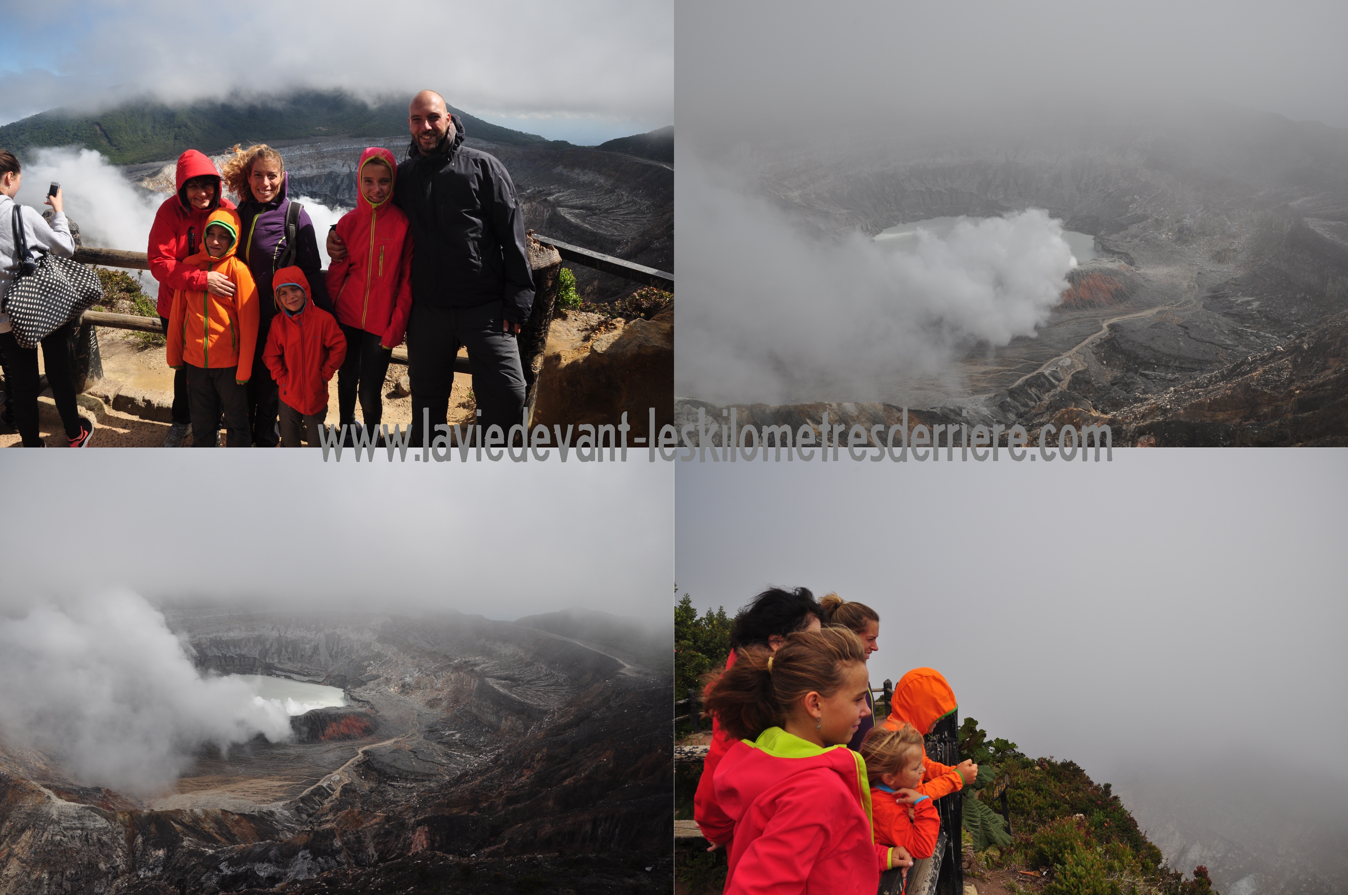Au matin suivant, nous sommes montés voir le volcan, ou plutôt son cratère et son lac. Le prix d’entrée des Parcs Costa Ricains sont franchement surfaits. Celui du volcan Poas coute 15$ par adulte… partant de cette constatation, nous avons demandé aux enfants de rester discrets à l’arrière afin de passer sans payer pour eux, ce que nous avons fait ! Je suis sincèrement pour le paiement de nos dus, mais lorsque je me sens volé, je réagis en fonction.