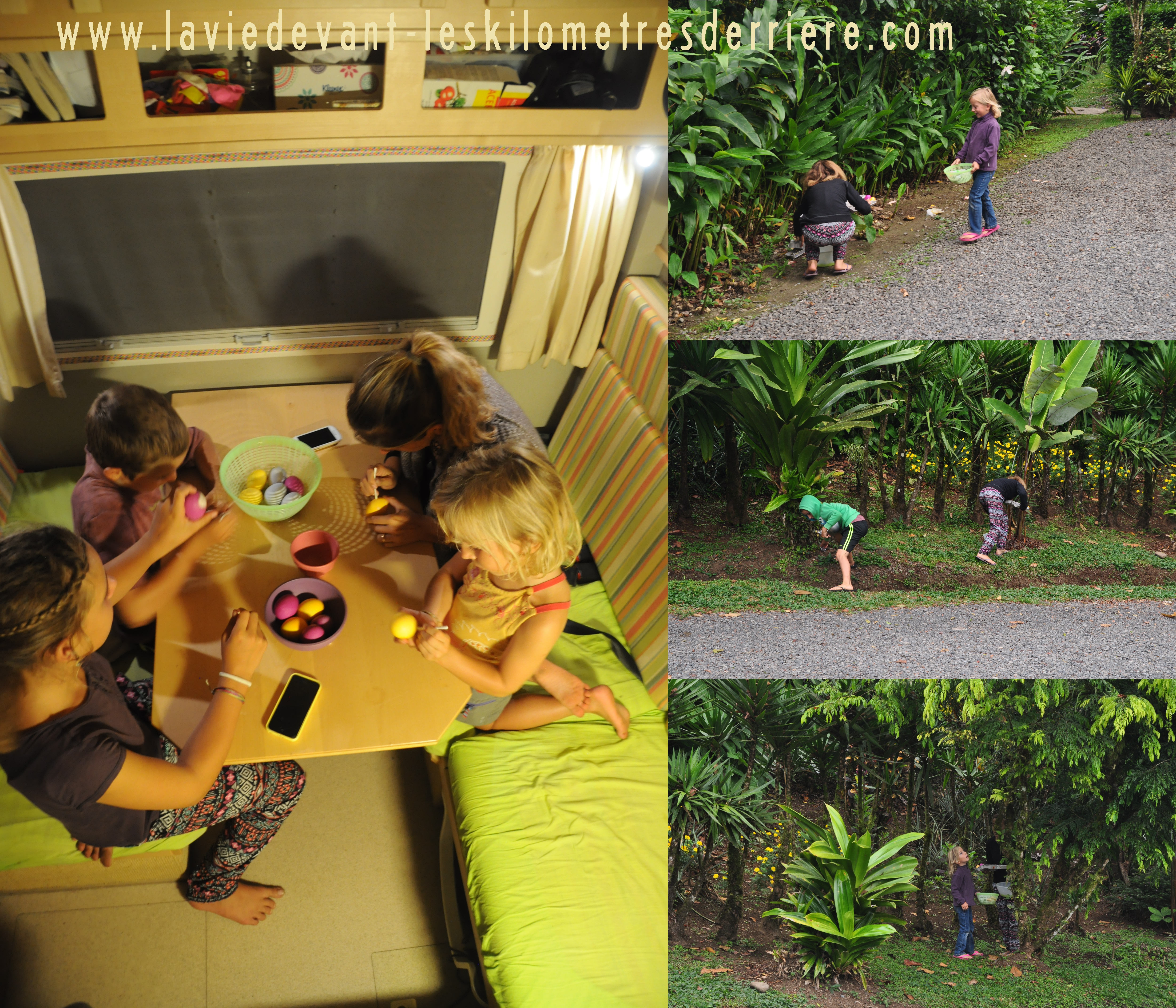 Le dimanche matin, il y avait une tradition à ne pas manquer ; Pâques ! Ce fut chose faite grâce aux chocolat et à la teinture pour œufs ramené par belle-maman. Les enfants ont eu un plaisir immense à pouvoir vivre cette tradition comme à la maison, ou presque. Un joli moment en famille en tous les cas…