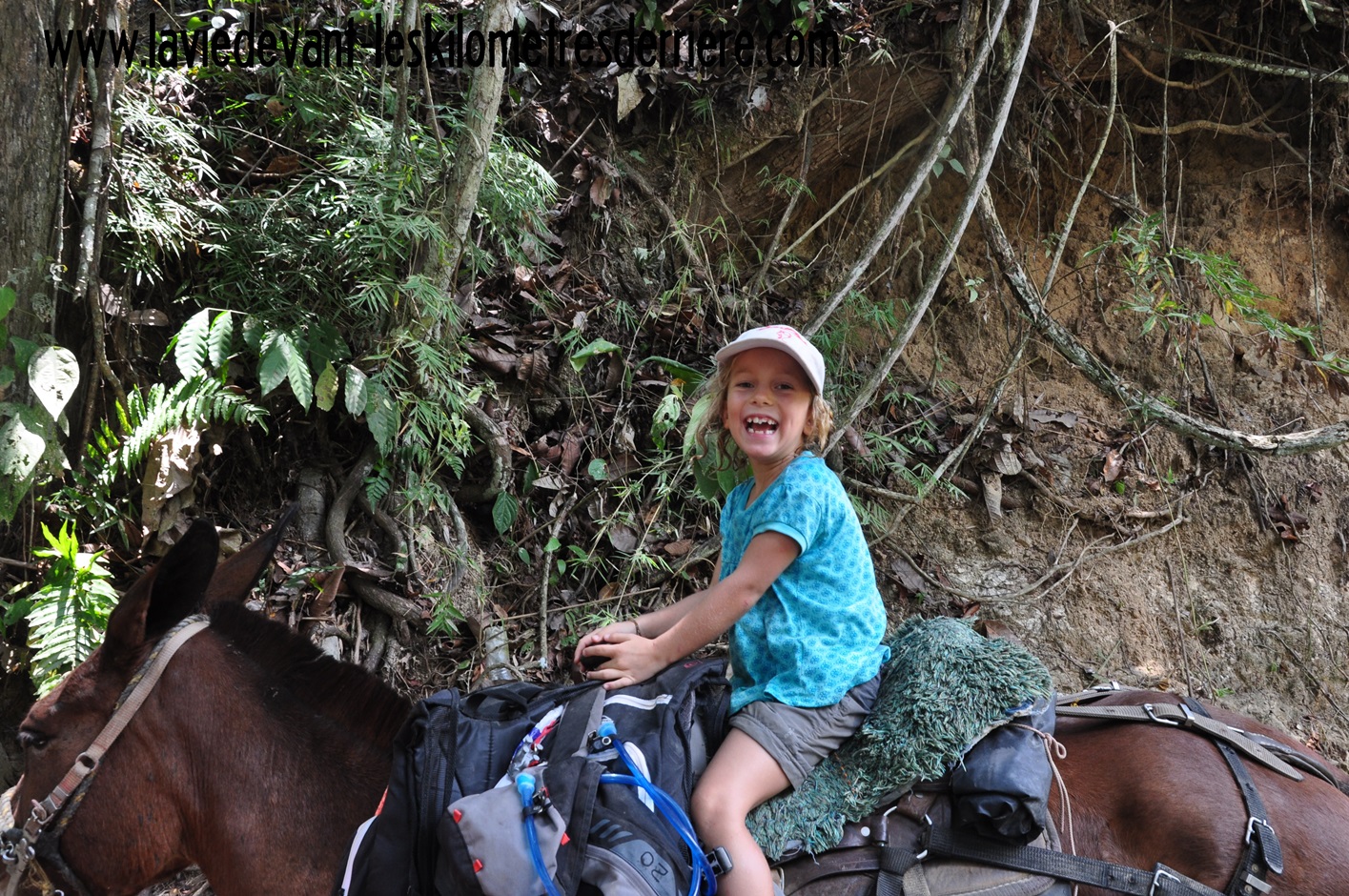 Merci à Laurent, Aude, Noémie, Léa, Enzo et Jil pour ce partage et cette aventure. Et comme père de famille, merci à mes enfants qui se sont dépensés sans compter, sans râler, qui auront fait preuve de bravoure et de courage, malgré les cloques, les douleurs et la chaleur parfois insupportable. Et comme tout le monde l’a dit sur le chemin, de notre groupe ou d’autres guides, la vraie championne fut Amélie. Du haut de ses 5ans et demi, elle aura bluffé tout le monde. Elle ne se sera jamais plainte, même le jour où l’on a marché 8h. Elle l’a fait au rythme des adultes sans broncher et elle, contrairement aux « vieux », elle avait encore la pèche pour s’amuser une fois arrivée au campement. Et voyez son sourire une fois mise sur la mule, sa récompense pour avoir bien marché, à 10min de l’arrivée finale. Quelle fierté !