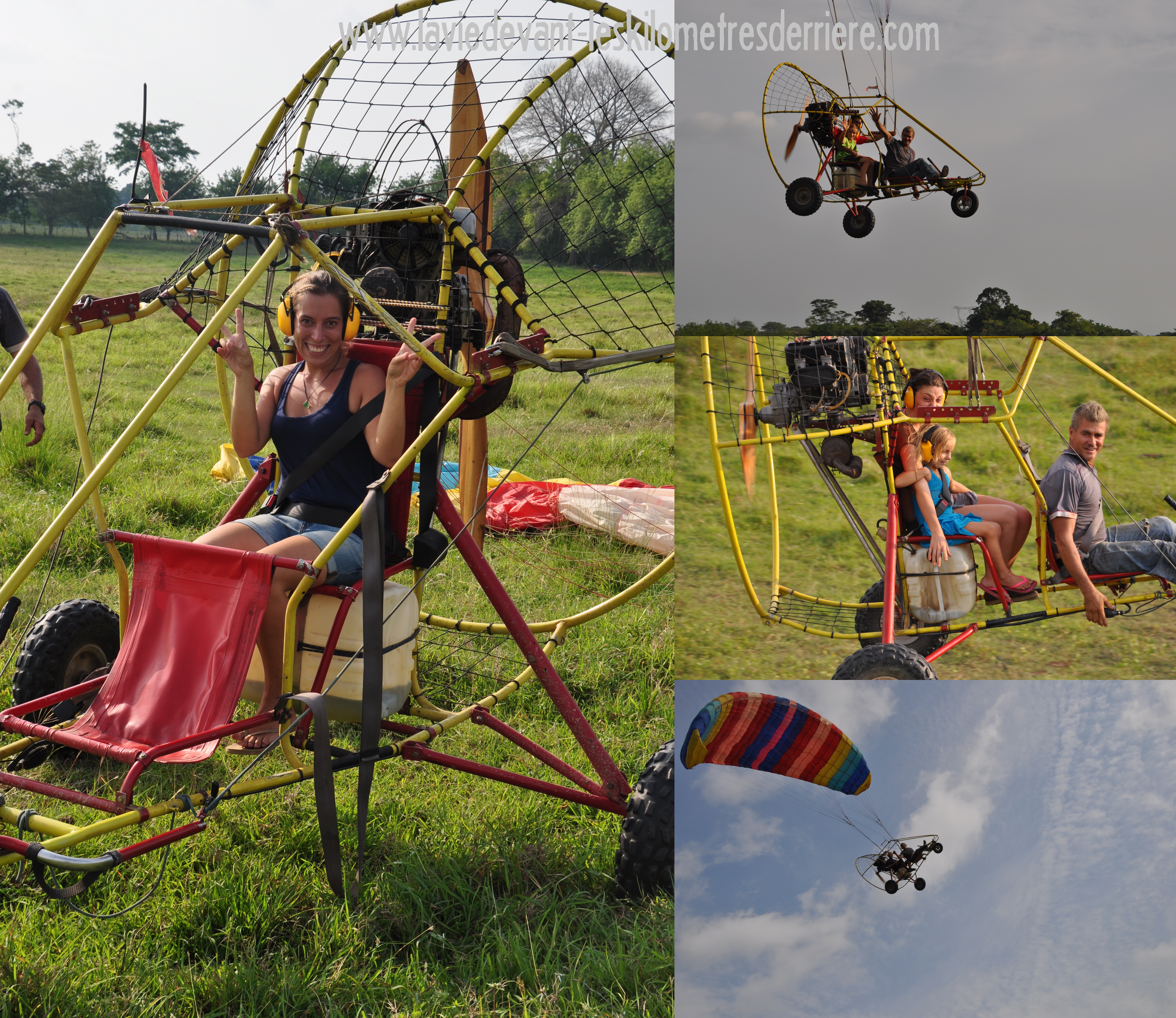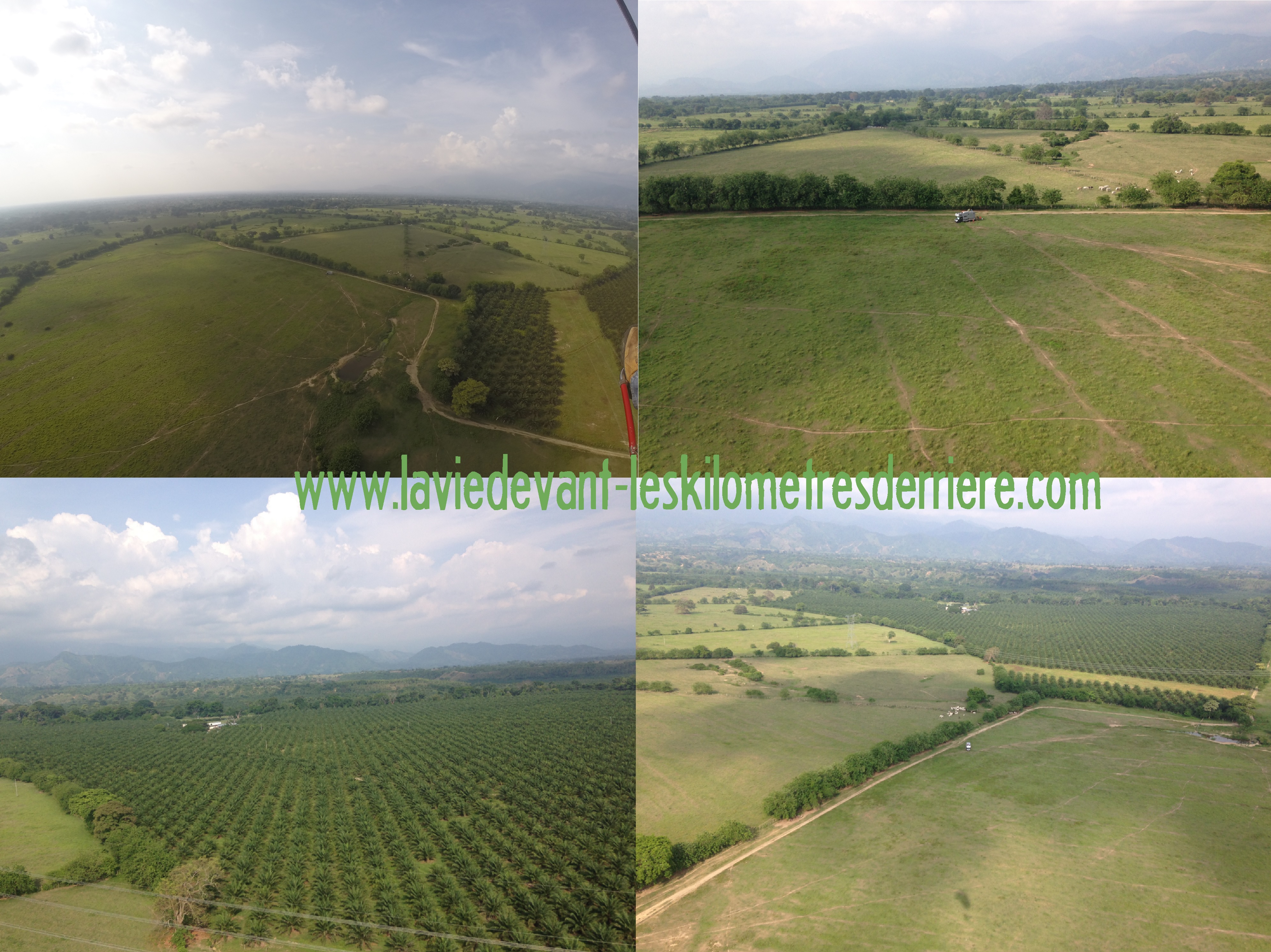 Nous passons rapidement aux choses sérieuse, Arthuro n’est pas du style à trainer, et il tient plus cela de sa mère allemande que de son père colombien (sans préjugés aucun). Après quelques rapides préparatifs, je suis le premier à embarquer. Incroyable, cette sensation de vol en parapente propulsé par une hélice est unique, nous n’avions jamais vécu un truc pareil. Et la plaine de San Martin se prête assez bien au jeu, offrant une vue plutôt dégagée sur l’étendue des champs de pâture, et quelques plantations de palmes. Nous volerons à tour de rôle, Jimmy étant accompagné par Carlos, l’ami d’Arthuro, et Amélie par Ornela. Elle n’a pas froid aux yeux cette choupette, même lorsqu’il faut monter sur la moto pour se rendre au lieu de décollage, distant de 300m. Seule Soraya, n’ayant que peu confiance en ces engins, n’aura pas volé.