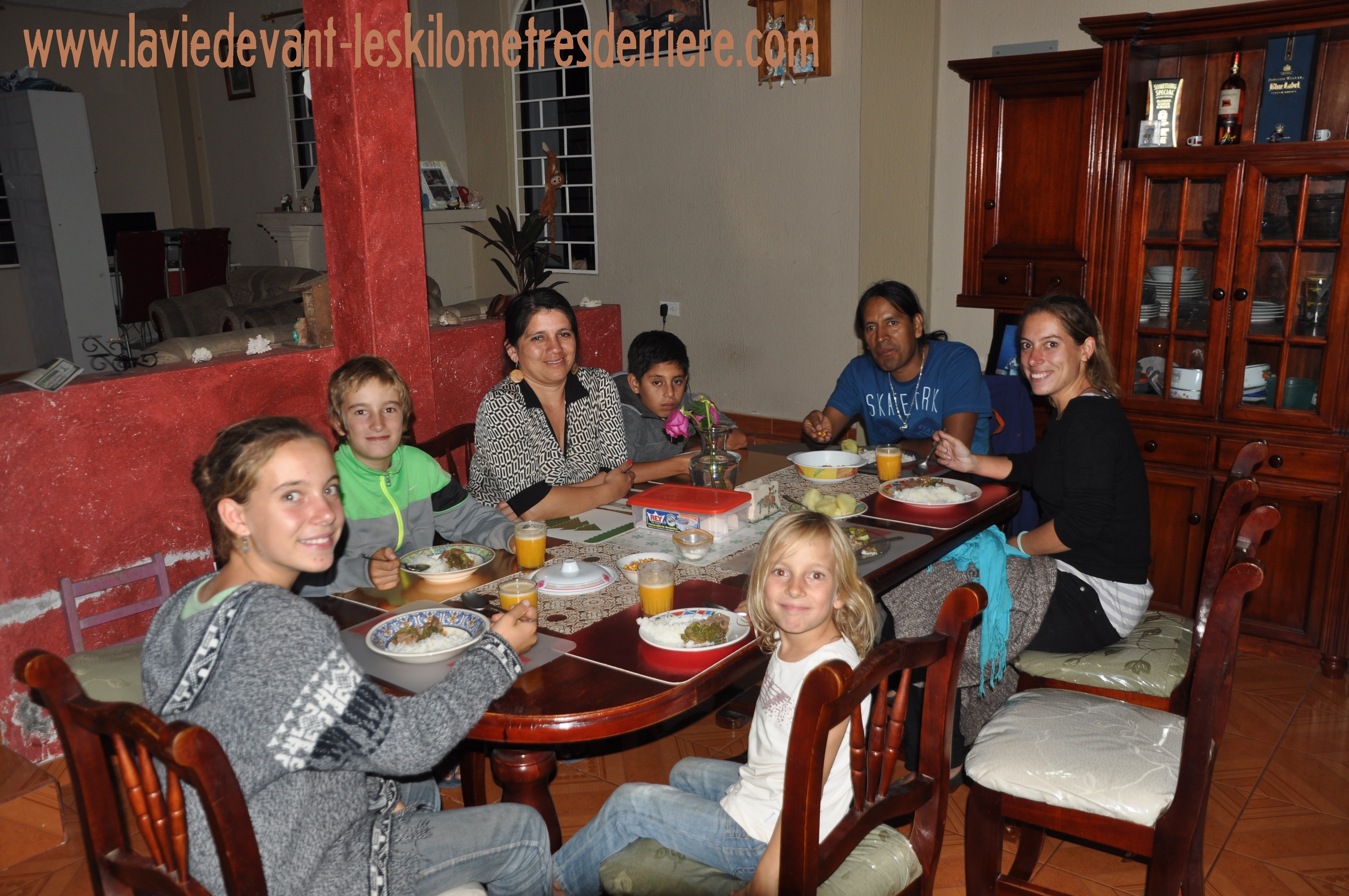 Herminda est colombienne. Elle s’est mariée à l’âge de 16 ans à Luis, le frère de Manuel. Ce sera elle qui prendra soin de nous durant ces 3 jours chez eux. Nous faisons connaissance et découvrons Herminda avec deux facettes. La première est celle d’une femme souriante, toujours prête à rigoler et d’un accueil exceptionnel. La deuxième, celle d’une femme loin de ses racines et seule, malgré la présence de sa belle-famille. Son mari, Luis, nous ne l’avons pas rencontré. Il fait partie de l’intelligence militaire équatorienne et est souvent en déplacement notamment lors de déplacement du président Correa à l’étranger. Nous partageons le premier repas mardi soir en compagnie de Manuel et Herminda, un plat préparé par cette dernière.