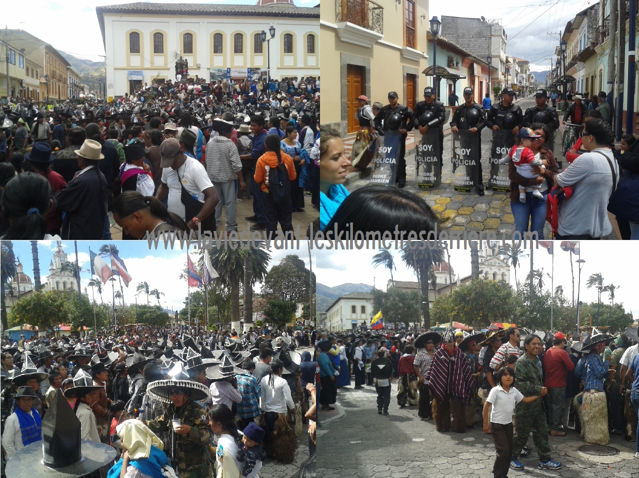 L’école terminée, Herminda nous invite à nous rendre au centre du village pour vivre ce moment traditionnel qu’est la St-Jean. Mais elle nous prévient, la fête peut dégénérer et devenir violente, traditionnellement. Cette fête est ancestrale et la plus importante des communautés alentours de Cotacachi. Elle est en relation avec le Solstice d’été et la mère-terre. Cette fête est là pour donner la force à la terre de donner suffisamment de récolte pour l’année à venir et au soleil de briller suffisamment pour faire grandir le grain.