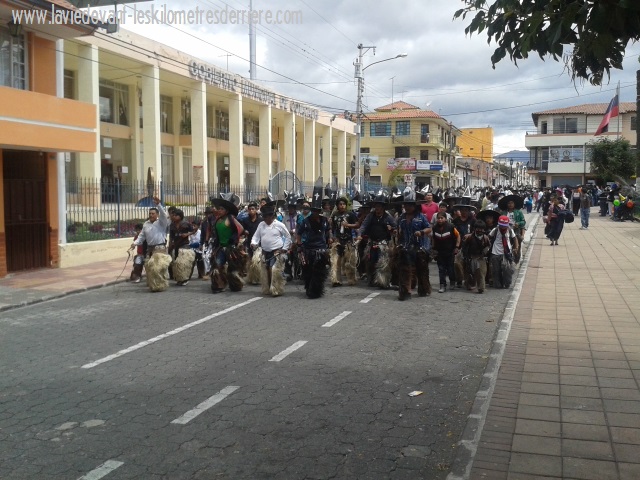 Lors de notre marche à la Laguna Cuicocha, Claire à fait la rencontre de Manuel, un équatorien vivant depuis 22ans en Italie et actuellement en vacances dans sa famille. Il nous a invités pour passer un moment de la fête de la St-Jean avec sa famille. Cette fête se déroule sur une semaine dans ce village. Toutes les communautés alentours se réunissent et danse autour de la place principale. Le 24, le premier jour, est réservé aux hommes.