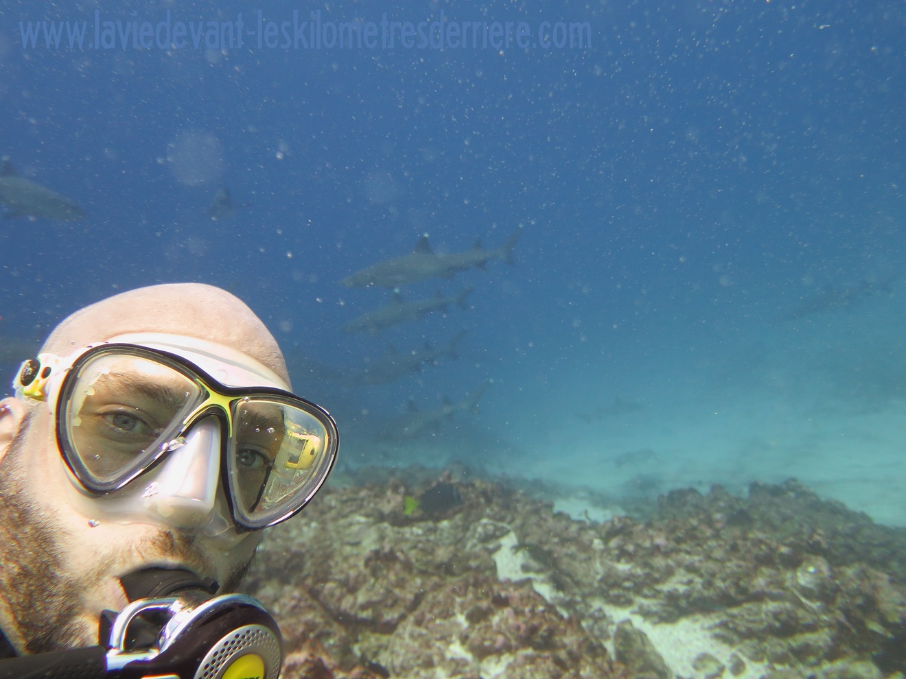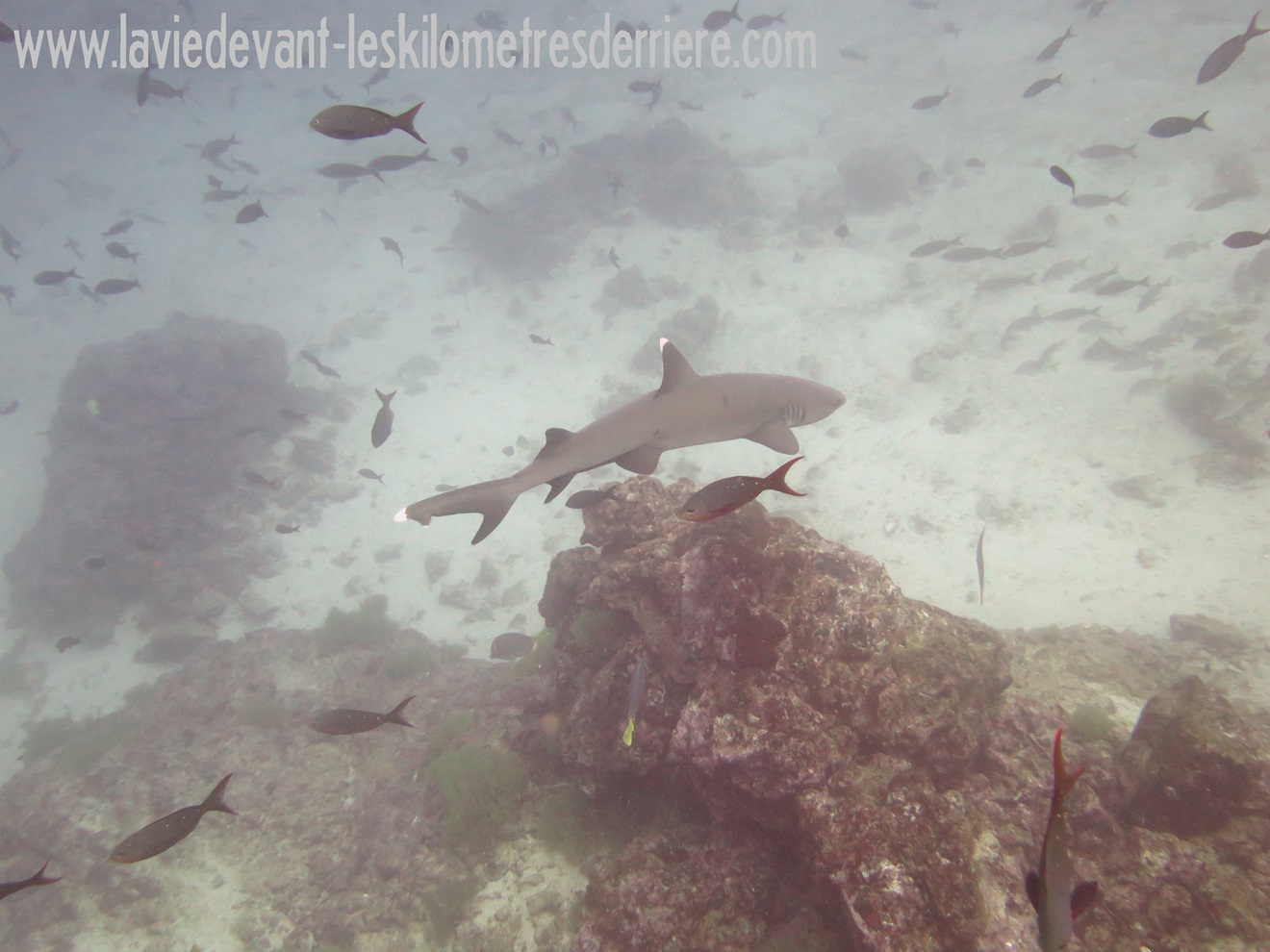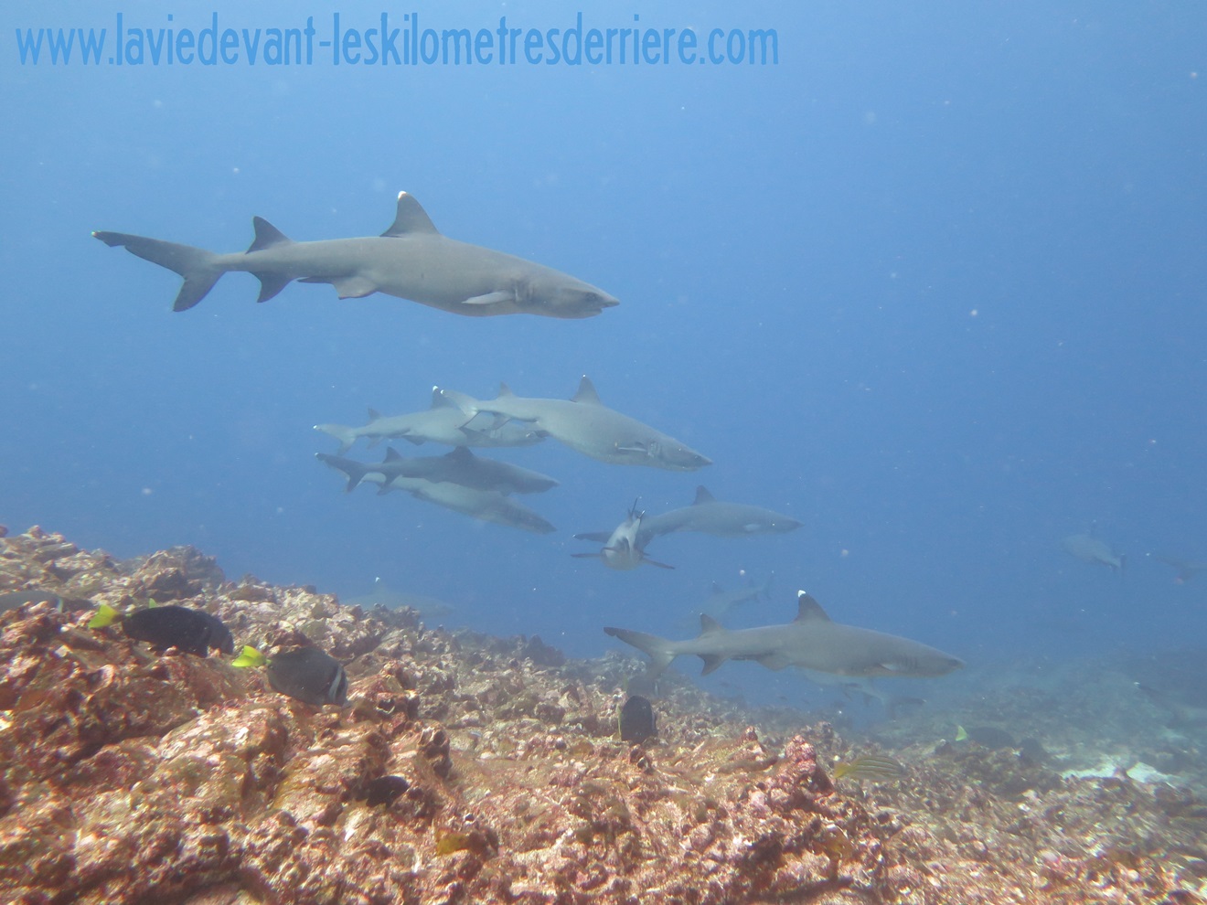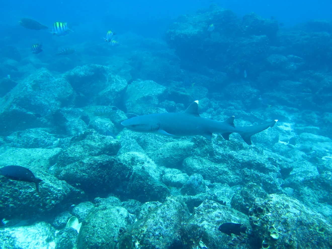 La première plongée, nous la faisons sur Mosquera. La plongée est belle et se termine par une rencontre avec un requin pointe blanche qui tourne autour de moi, à environ un mètre !
