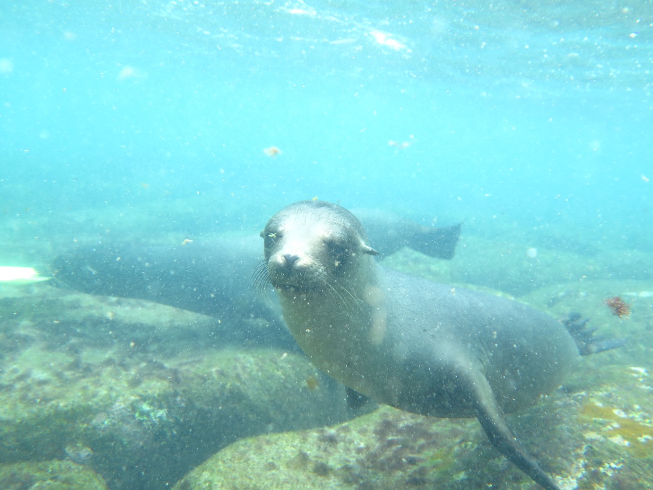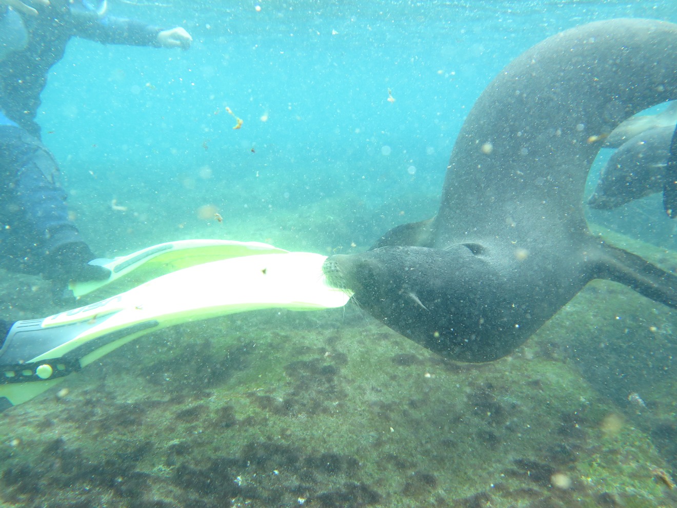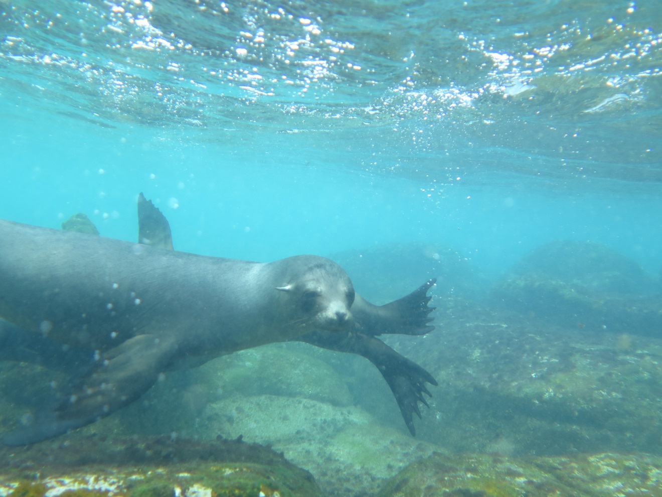 Entre deux plongées, nous profitons de faire du snorkeling avec les phoques des Galapagos, très joueuses.