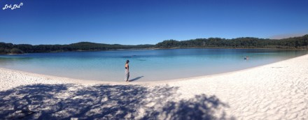 La première destination, après nos premier kilomètres à l’intérieur de l’ile sur des pistes sans grandes difficultés mais brassant tout de même, c’est le Boomanjin Lake. Comme tous les autres lacs sur l’ile, il est constitué uniquement d’eau de pluie. Mais celui-ci, étant entouré de Tee Tree, sa couleur vire au brun-rouge.