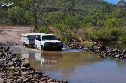 C’est depuis là que commence le voyage sur la piste. Pour arriver au camping d’El Questro où nous passerons un après-midi chill-out, c’est quelques 16km à parcourir sur une affreuse tôle ondulée, mais offrant deux superbe passage de rivière.