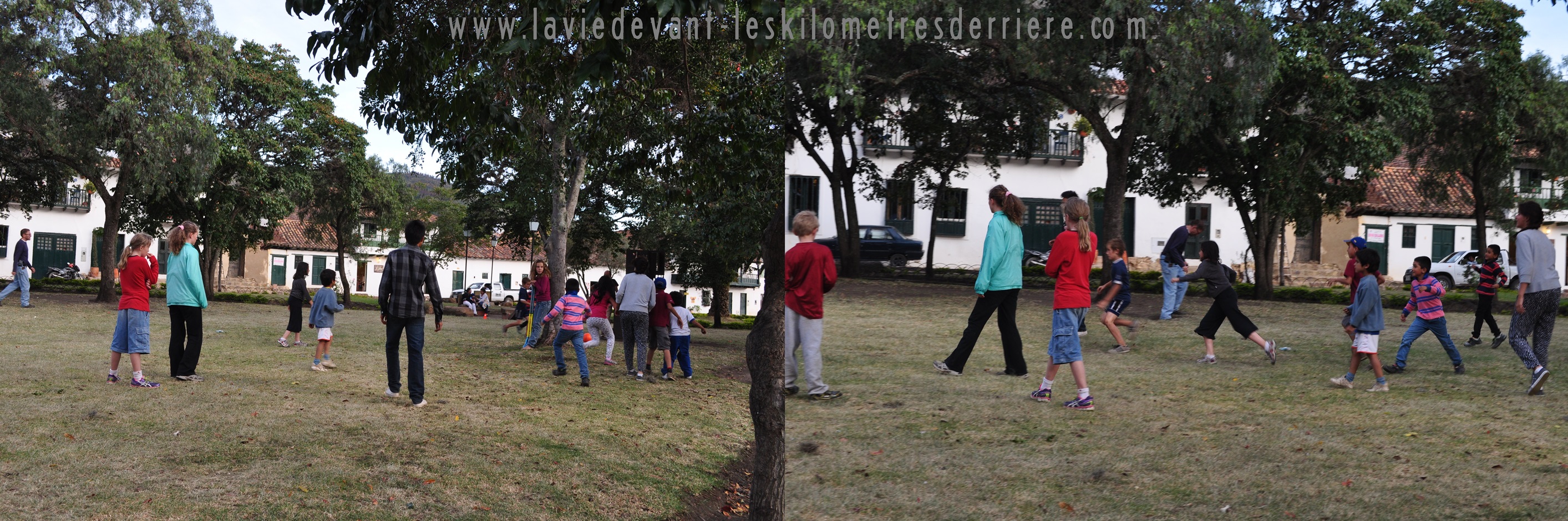 Nous arrivons, lundi soir, à Villa de Leyva et ce ne fut pas sans peine entre Monquira et Santa Rosa. Près de 20km de piste, parfois terriblement défoncée, ce qui nous a valu de toucher de réservoir de carburant et deux fois la roue de secours. Peut-être aurions-nous pu passer par Tunja, là où la route est asphaltée. Peu importe, nous y sommes et trouvons rapidement un lieu pour bivouaquer, sur le parque Narino. Depuis là, nous avons un peu tout à proximité comme les magasins de légumes, une quincaillerie (finalement utile pour réparer le klaxon) et quelques restaurants. Peu après notre arrivée, Jil nous a rejoints et nous allons passer quelques jours en sa compagnie. Voyageant seul, il apprécie la compagnie d’autres voyageurs, et nous-même nous apprécions sa présence discrète et il faut dire que les enfants adorent passer du temps avec lui.